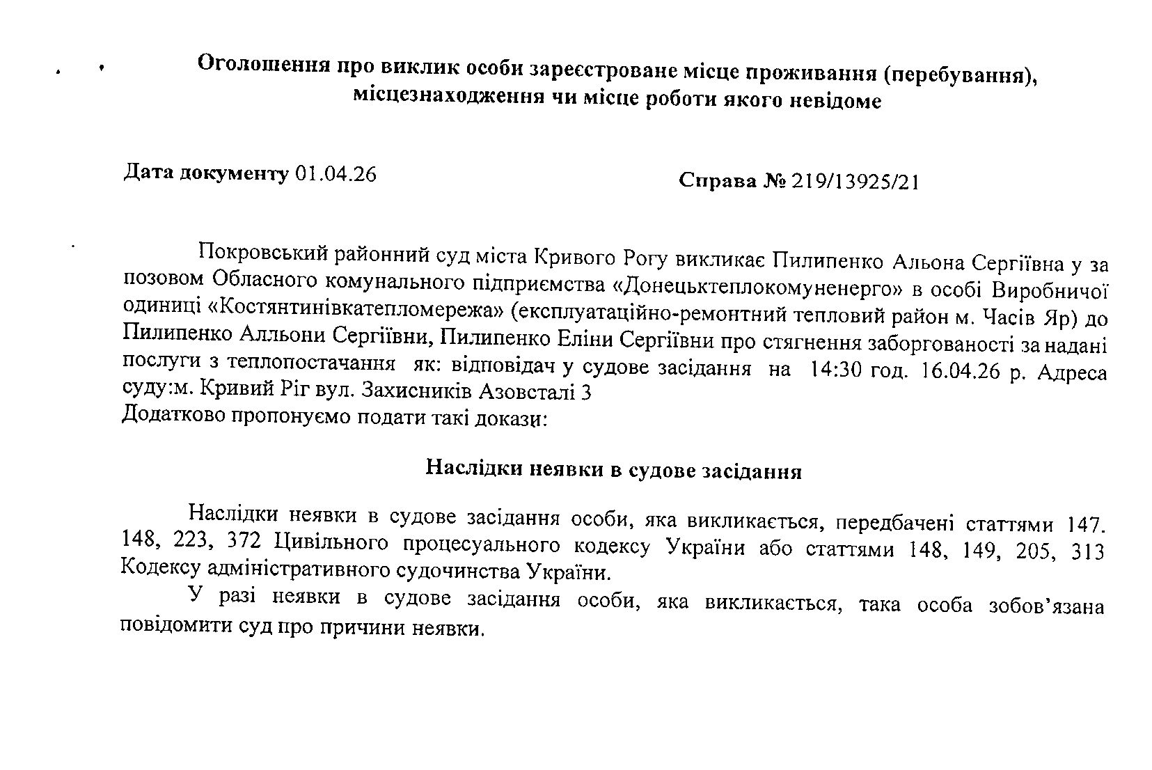 Оголошення про виклик до суду Пилипенко Альони Сергіївни