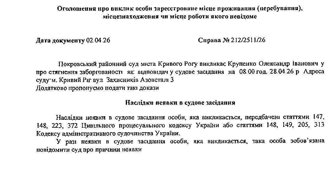 Оголошення про виклик до суду Крупенка Олександра Івановича