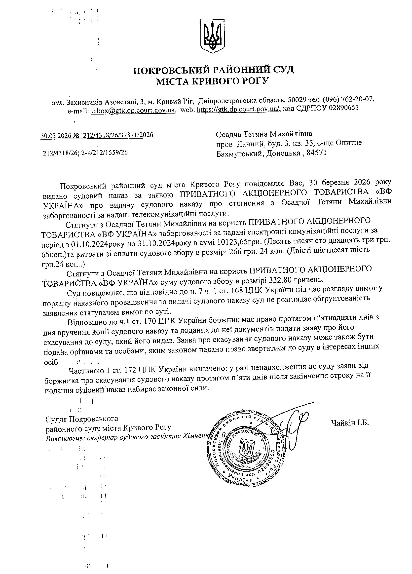 Повідомлення про видачу судового наказу зазаявою ПАТ "ВФ Україна" до Осадчої Тетяни Михайлівни про стягнення заборгованості