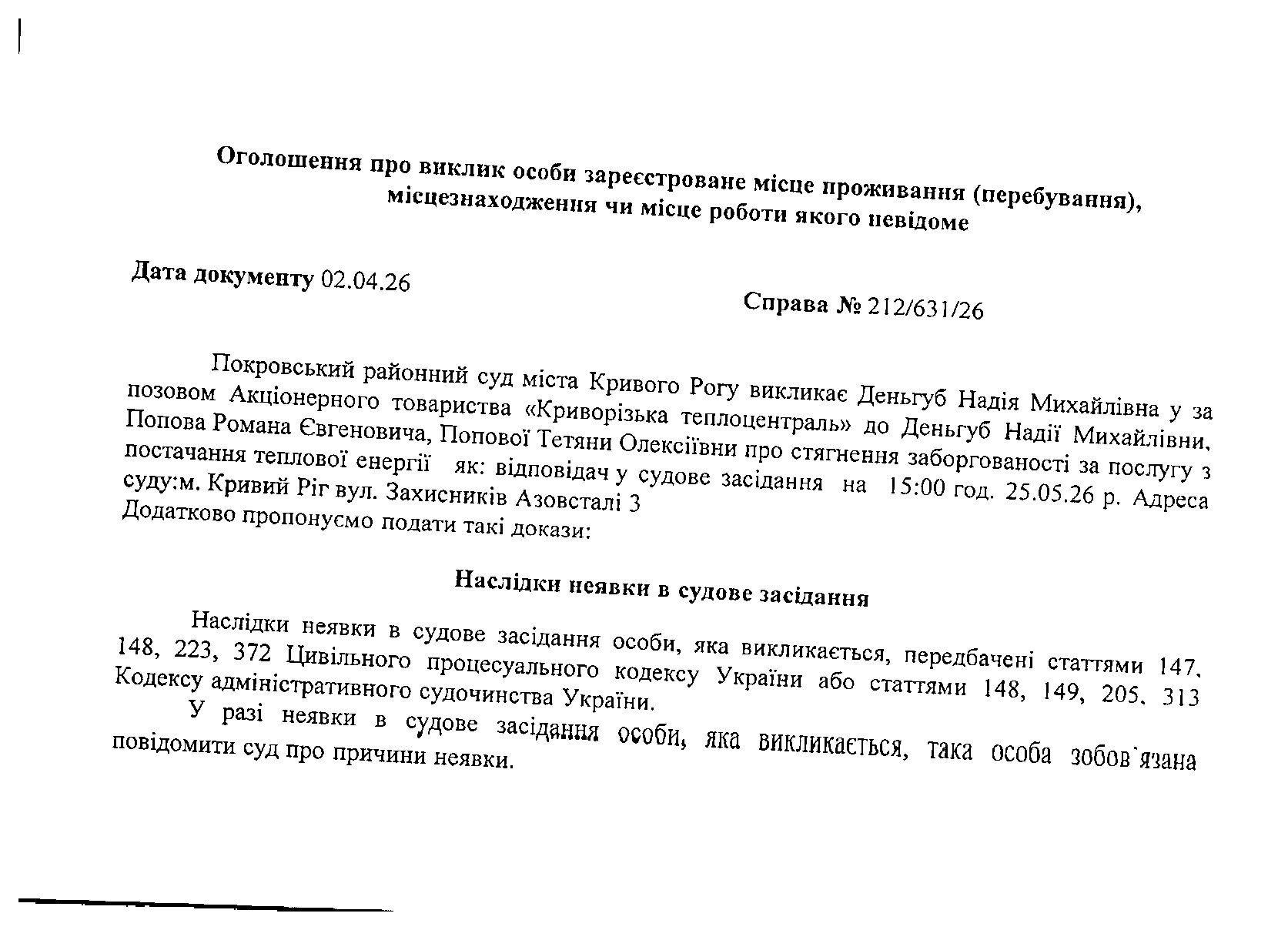 Оголошення про виклик до суду Деньгуб Надії Михайлівни