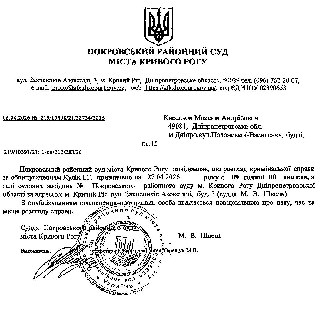 Оголошення про виклик до суду Кисельова Максима Андрійовича