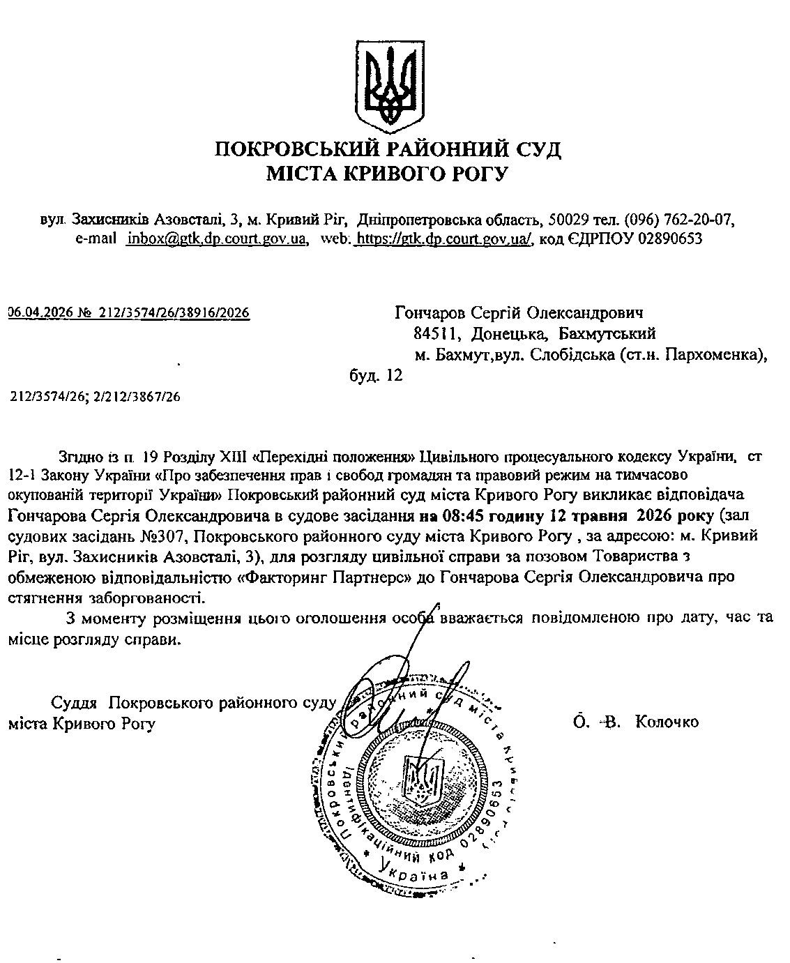 Оголошення про виклик до суду Гончарова Сергія Олександровича