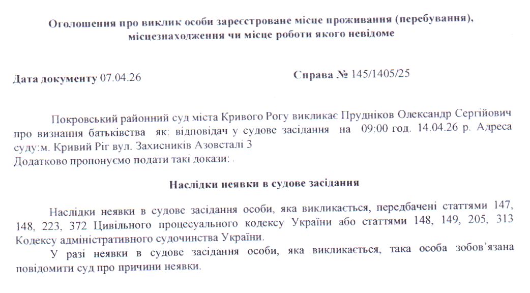 Оголошення про виклик до суду Пруднікова Олександра Сергійовича