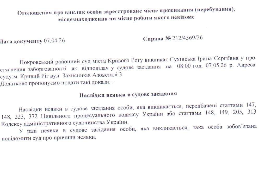 Оголошення про виклик до суду Сухінської Ірини Сергіївни