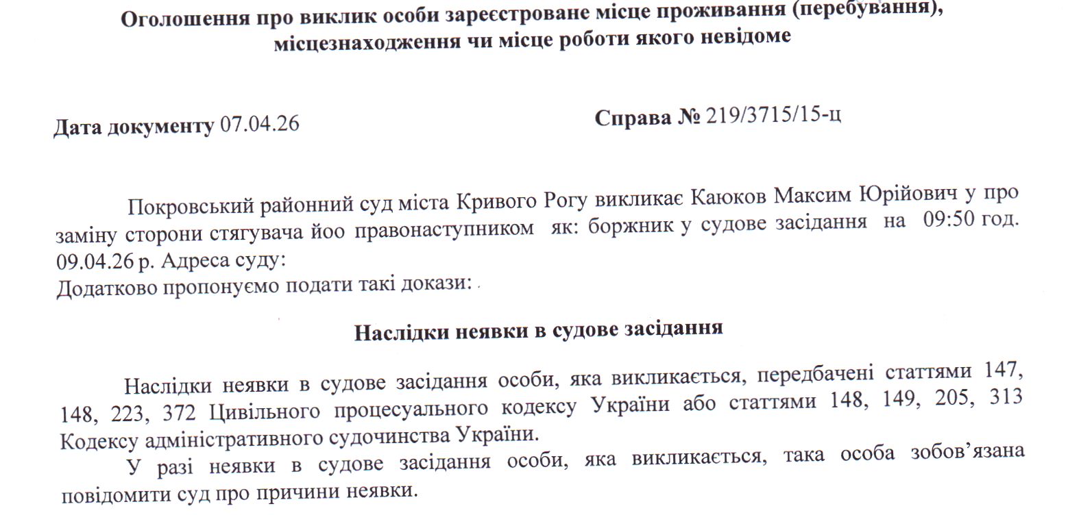 Оголошення про виклик до суду Каюкова Максима Юрійовича