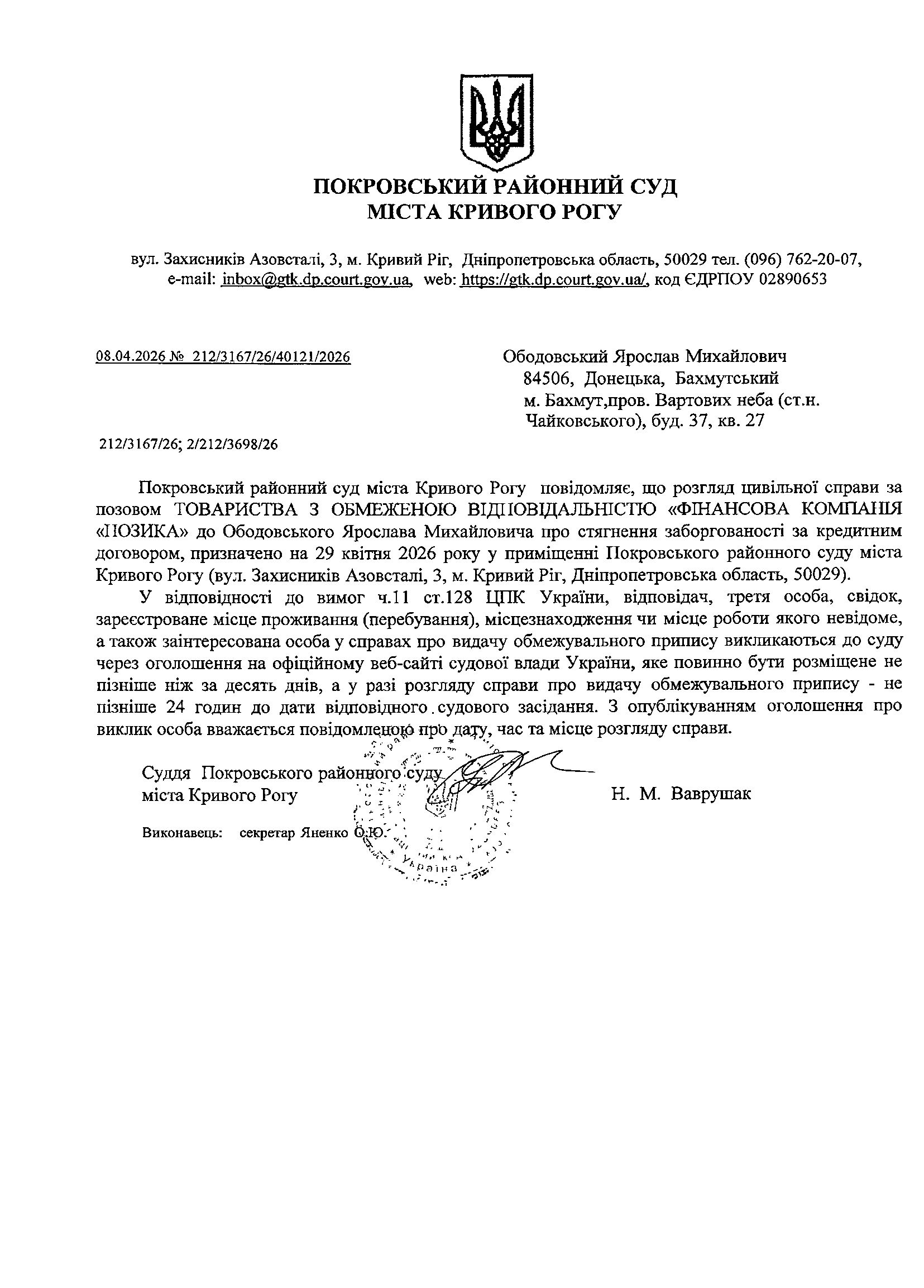 Оголошення про виклик до суду Ободовського Ярослава Михайловича
