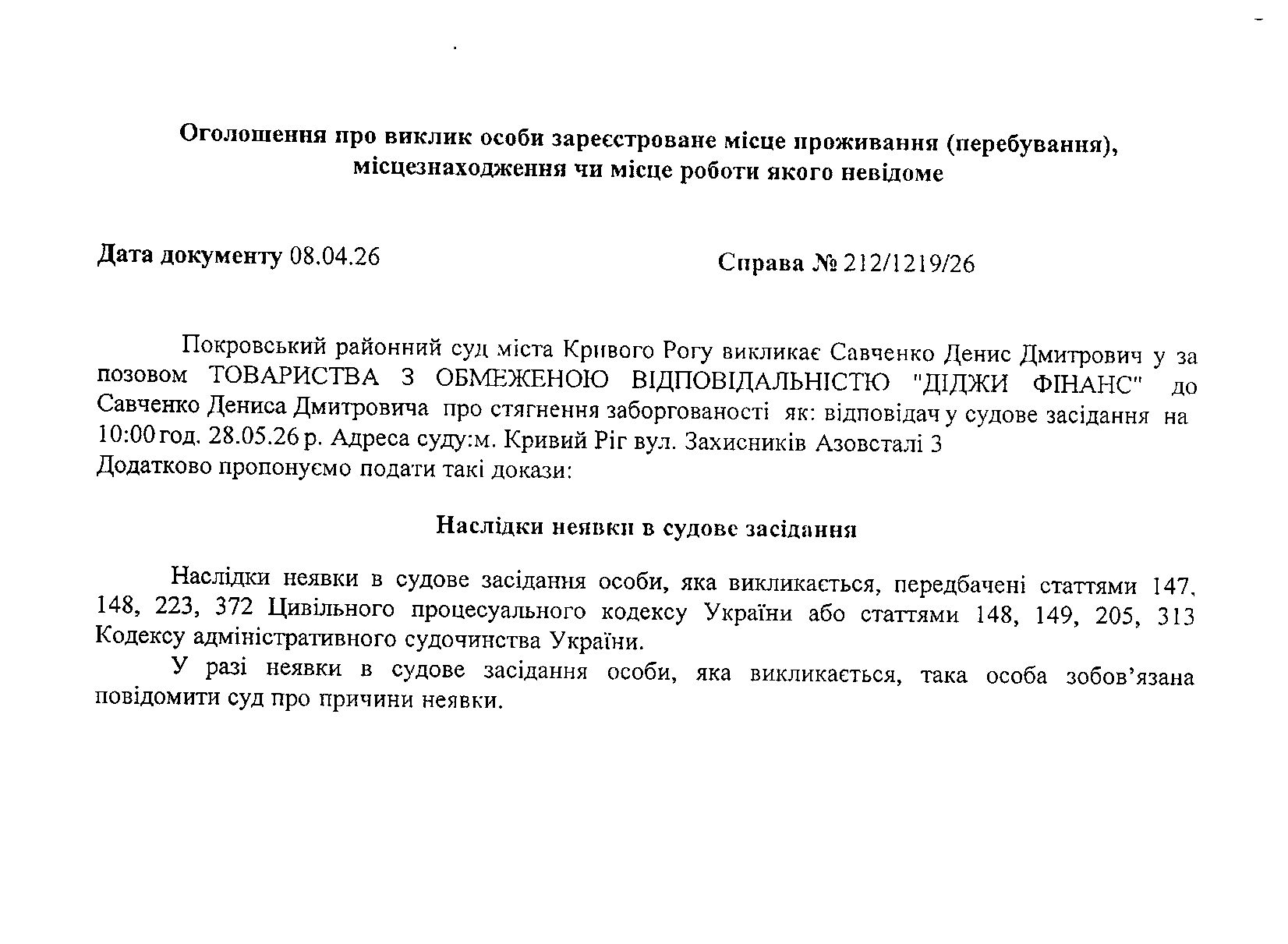Оголошення про виклик до суду Савченка Дениса Дмитровича
