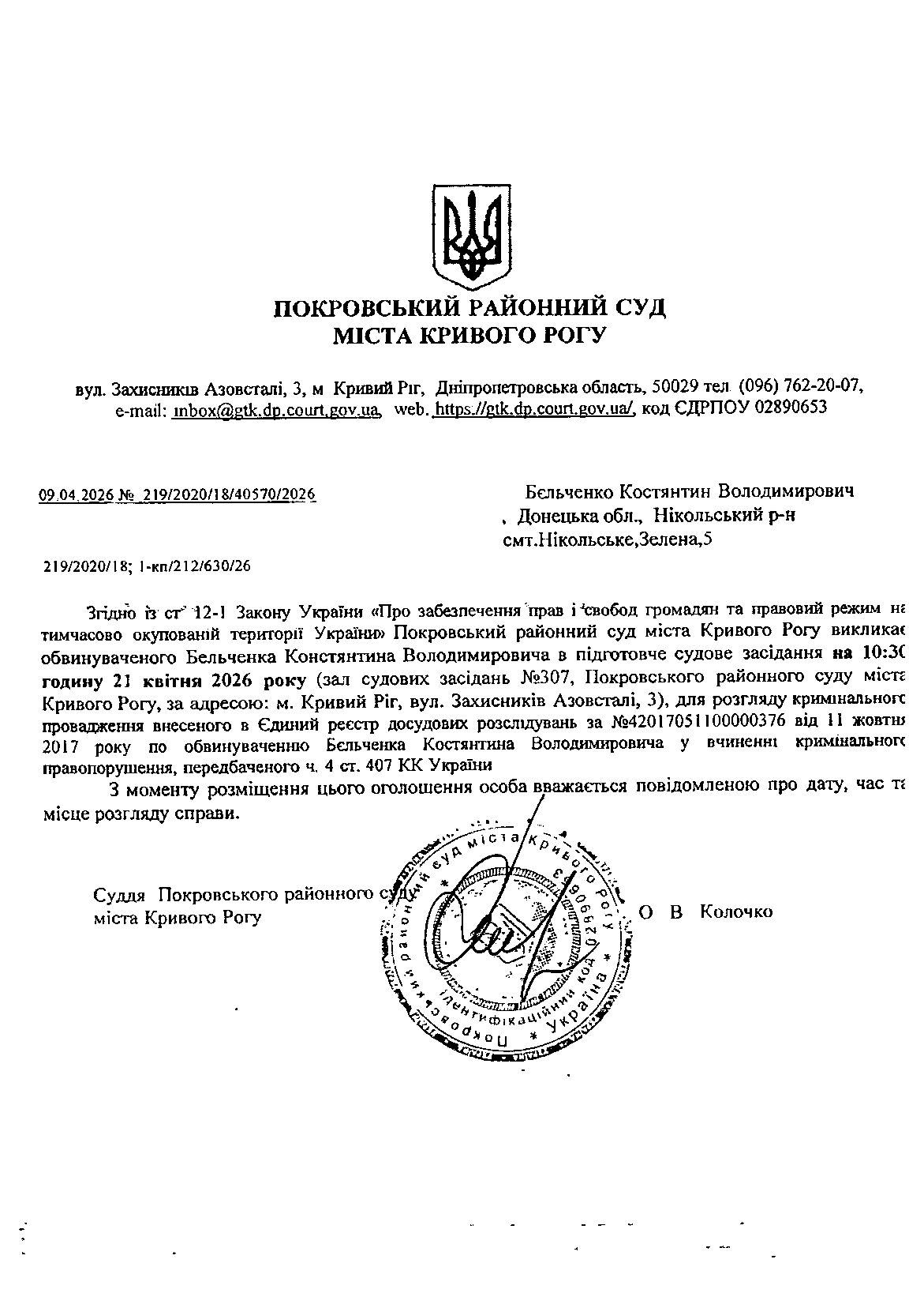 Оголошення про виклик до суду Бельченка Костянтина Володимировича