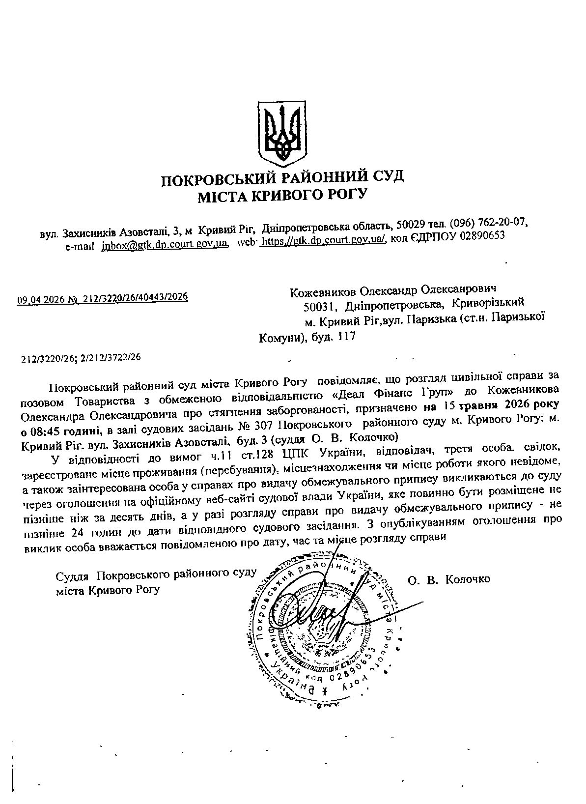 Оголошення про виклик до суду Кожевникова Олександра Олександровича