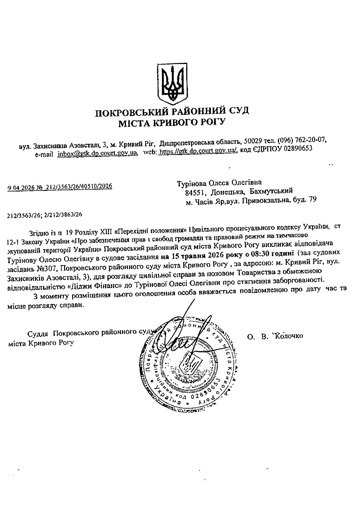 Оголошення про виклик до суду Турінової Олесі Олегівни