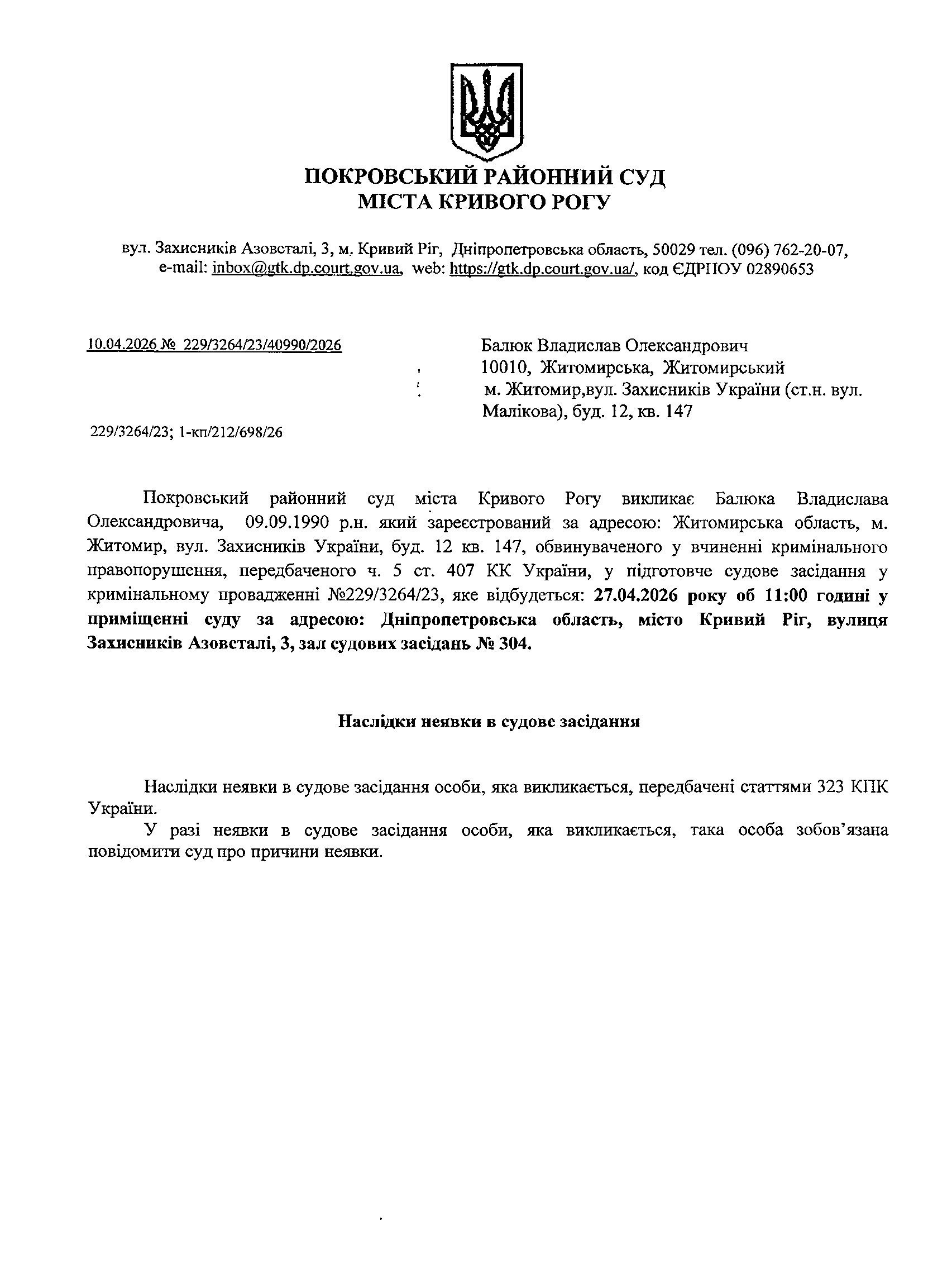 Оголошення про виклик до суду Балюка Владислава Олександровича