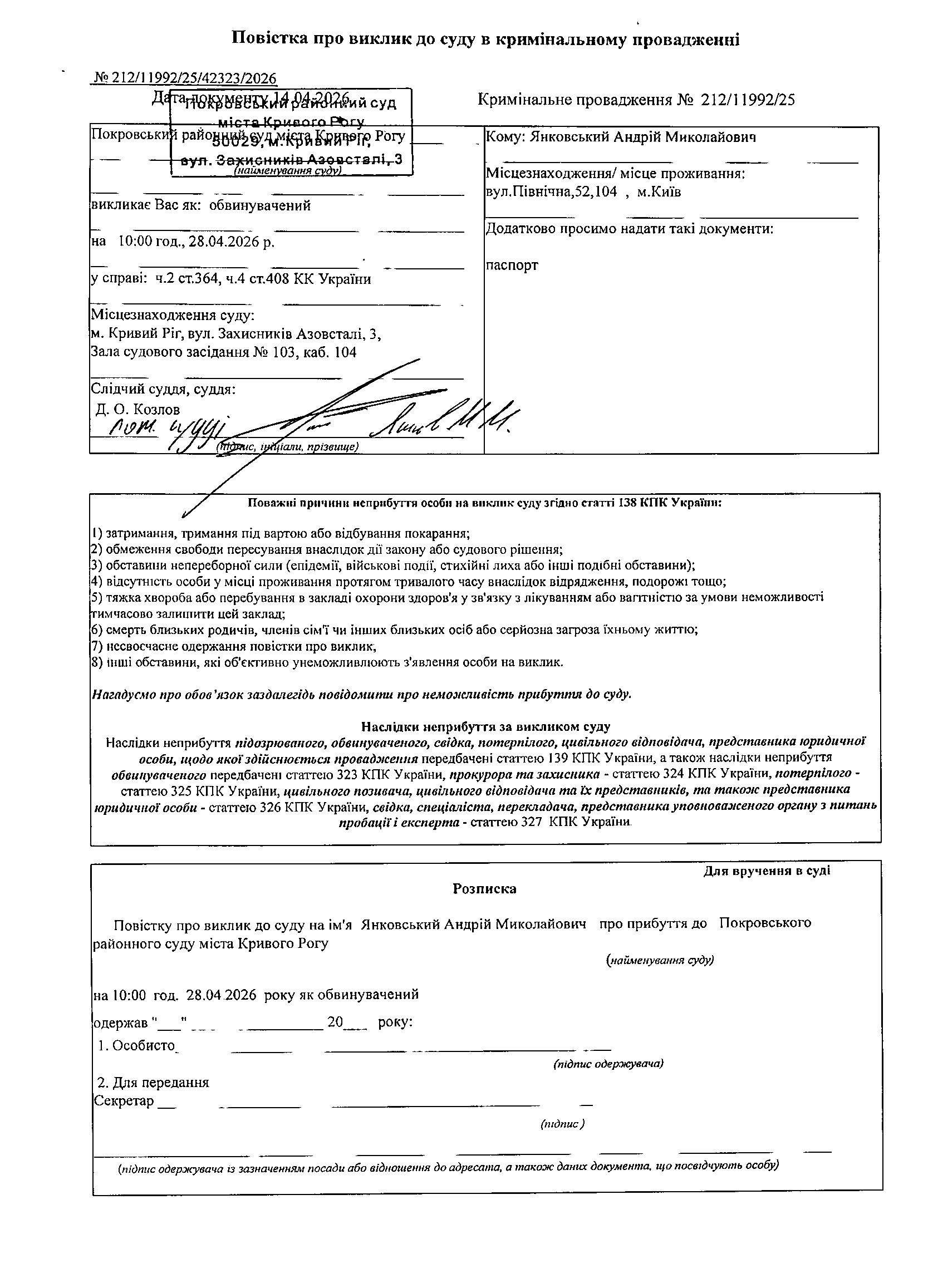 Оголошення про виклик до суду Янковськовського Андрія Миколайовича