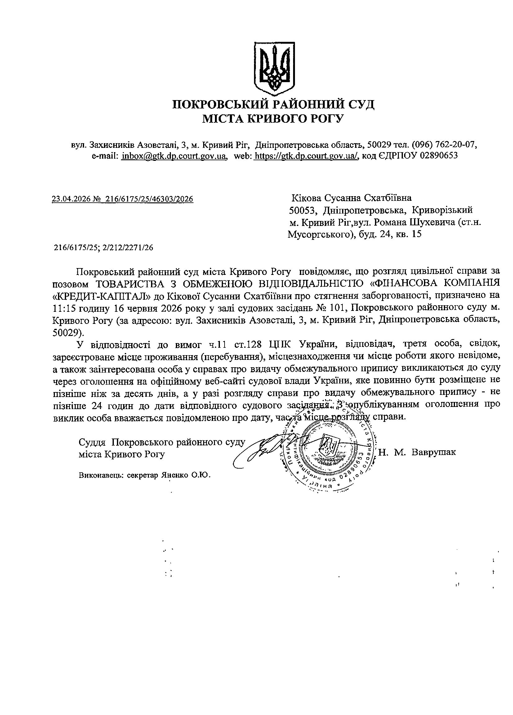Оголошення про виклик до суду Кікової Сусанни Схатбіївни