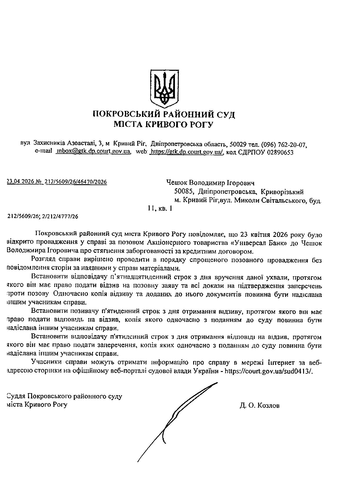 Оголошення про виклик до суду Чешка Володимира Ігоровича