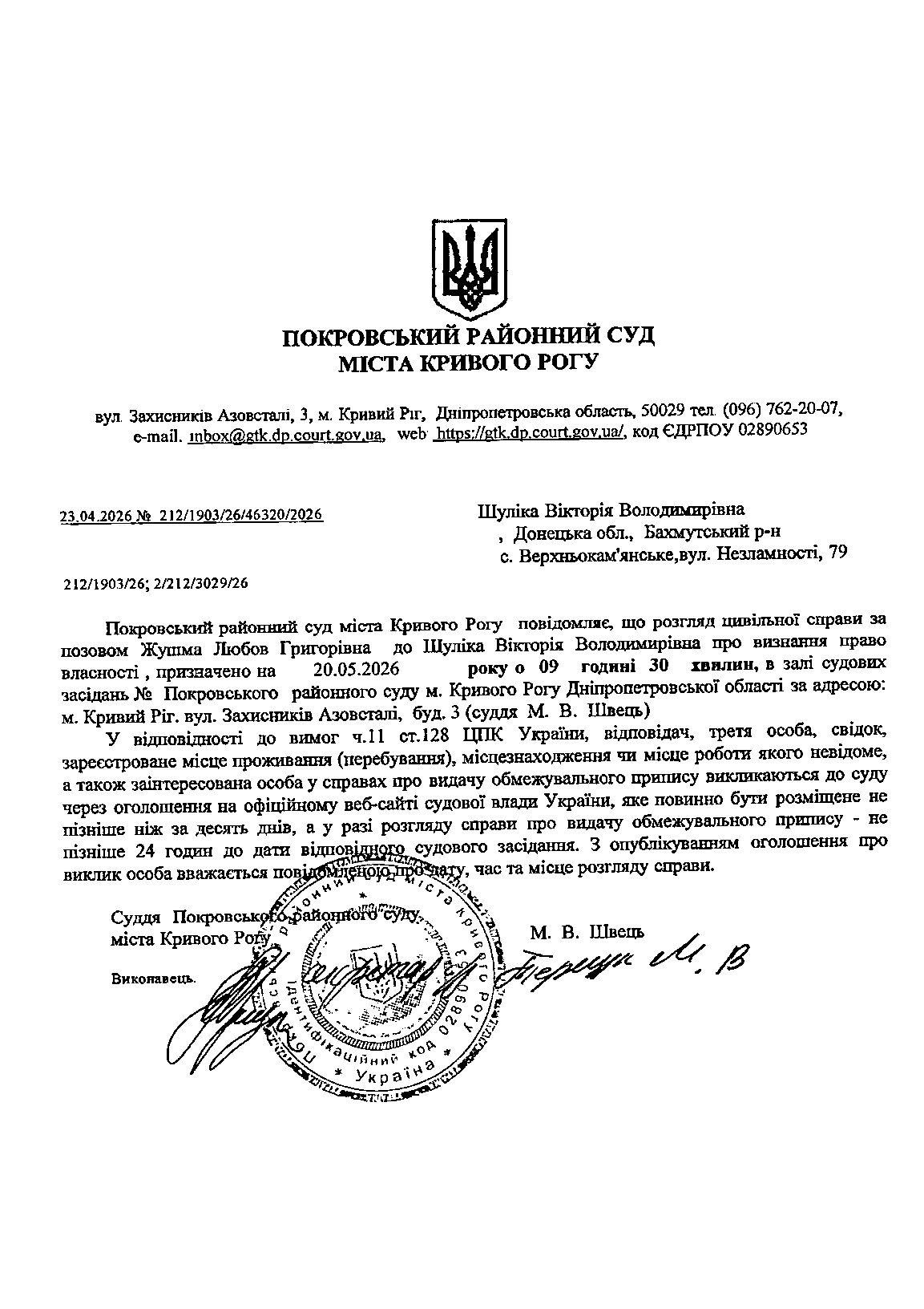 Оголошення про виклик до суду Шуліки Вікторії Володимирівни