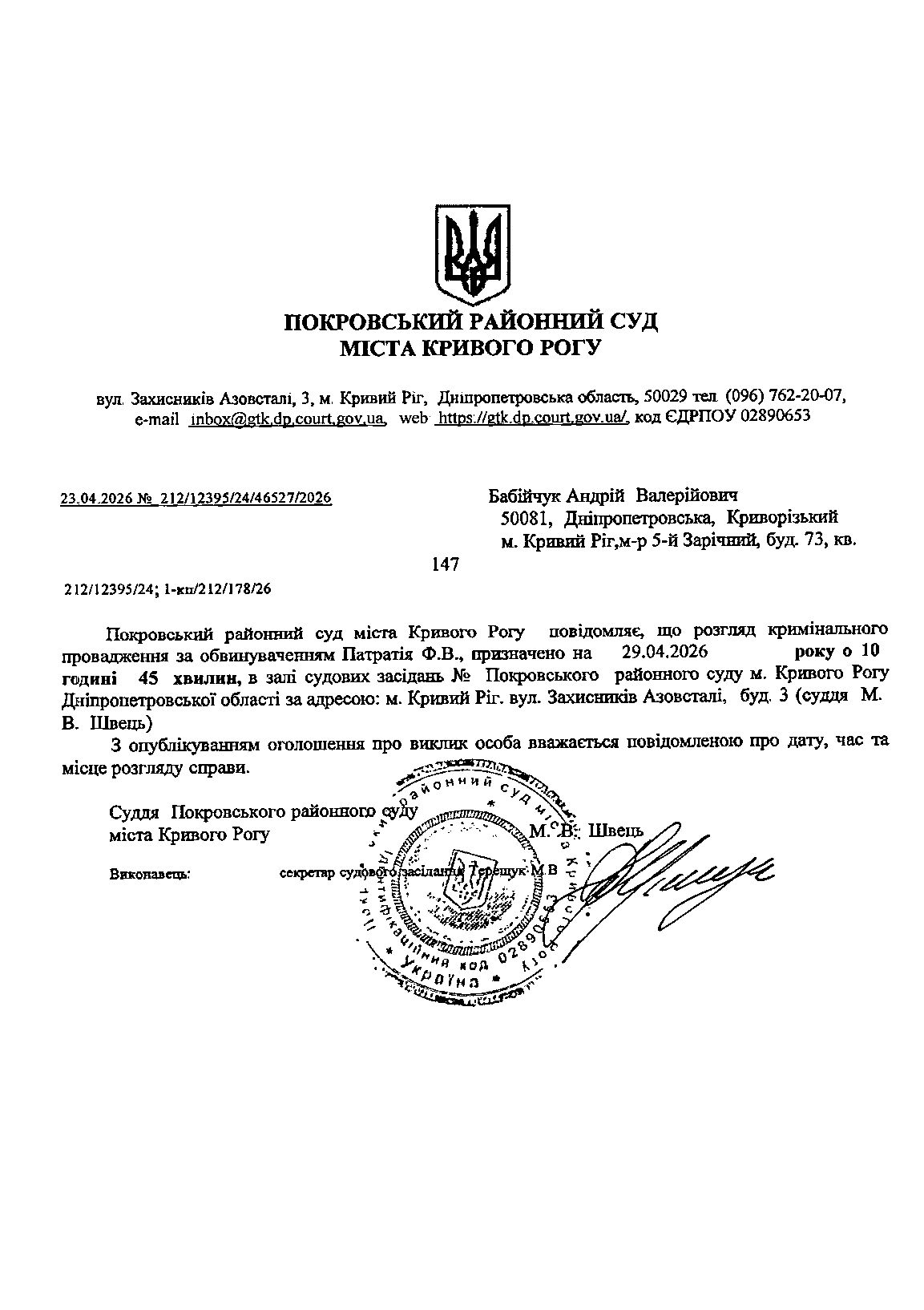 Оголошення про виклик до суду Бабійчука Андрія Валерійовича