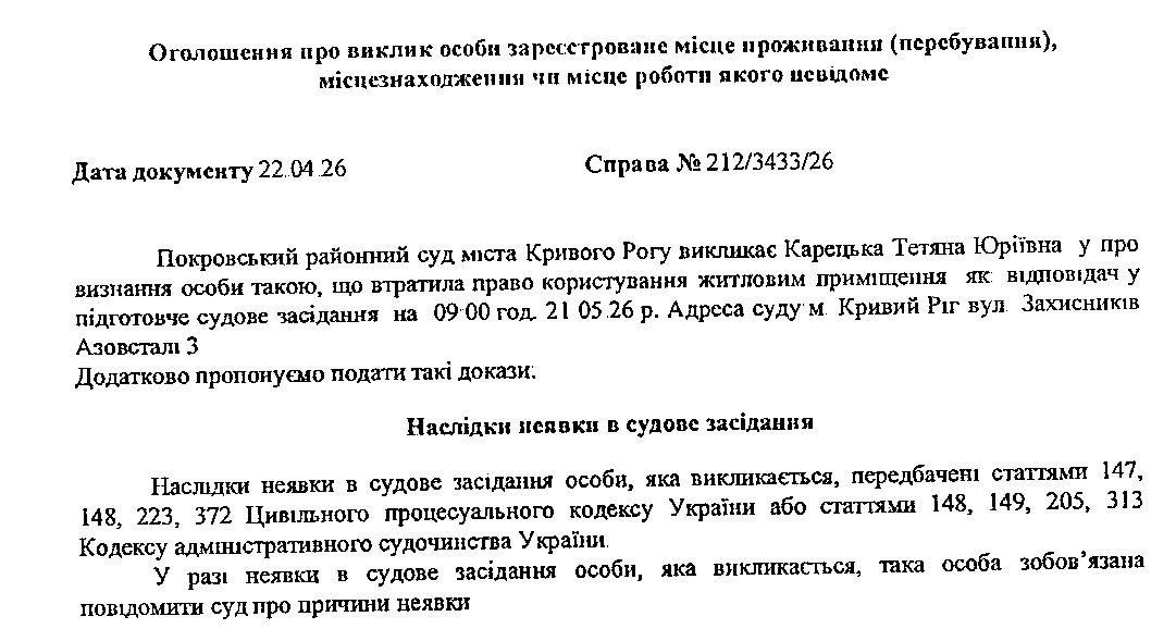 Оголошення про виклик до суду Карецької Тетяни Юріївни