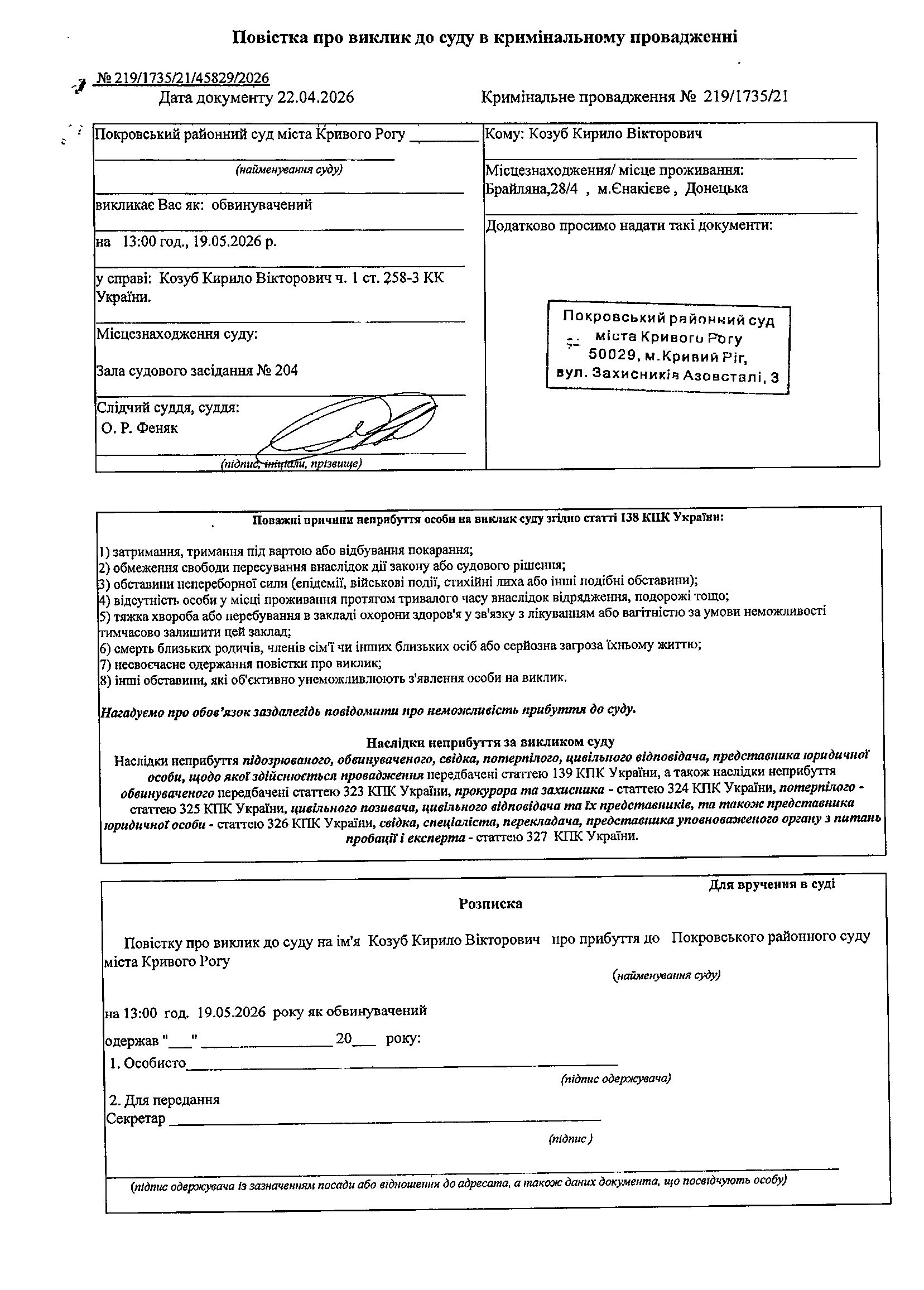 Оголошення про виклик до суду Козуба Кирила Вікторовича