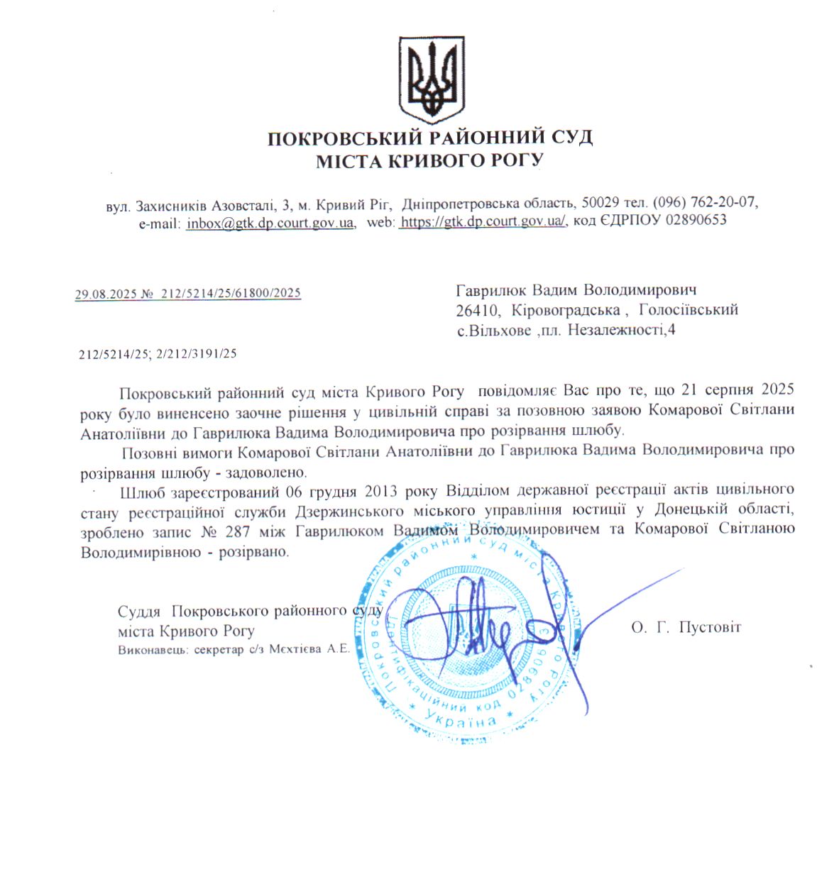 Повідомлення про розгляд цивільної справи за позовом Комарової Світлани Анатоліївни до Гаврилюка Вадима Володимировича про розірвання шлюбу
