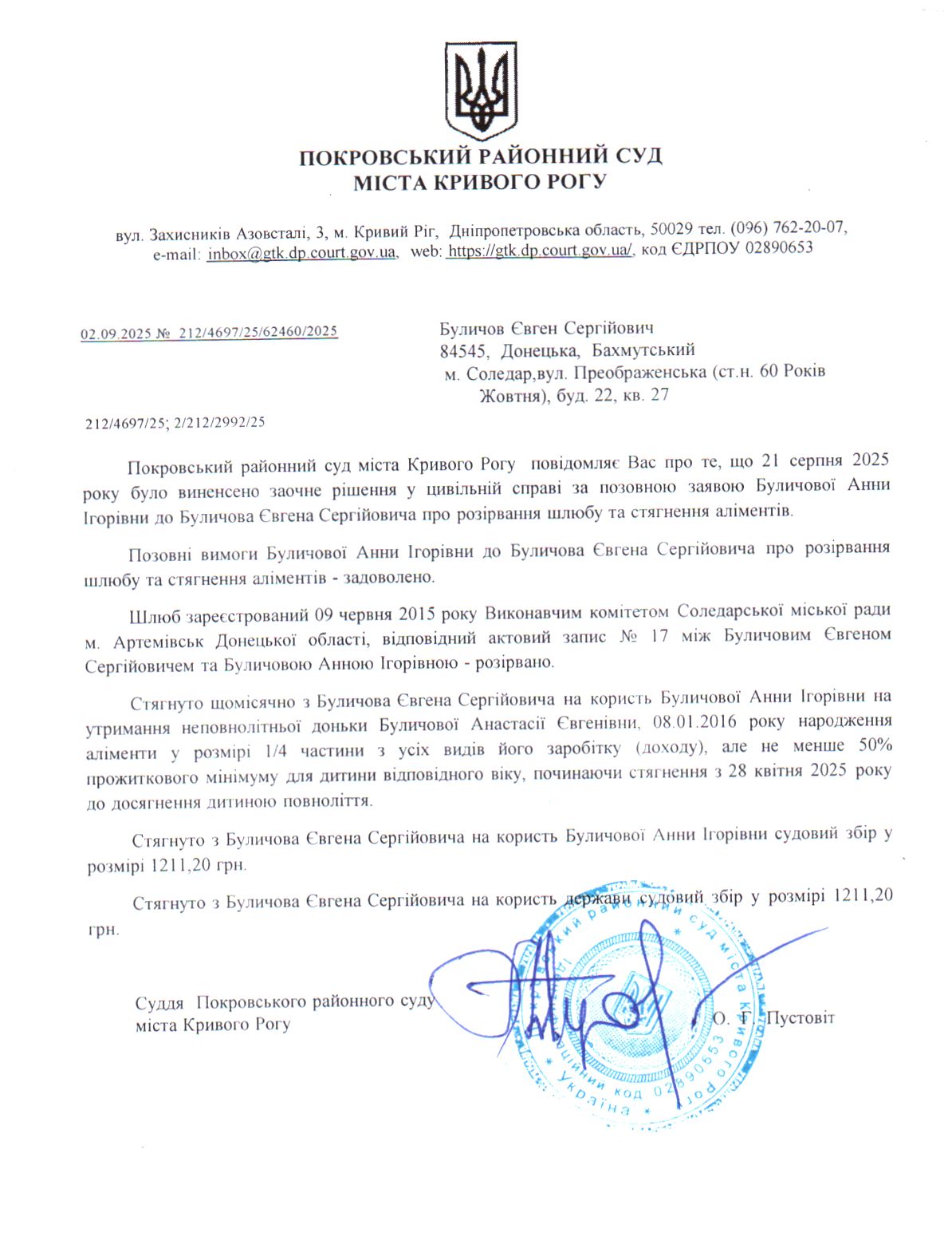 Повідомлення про розгляд цивільної справи за позовом Буличової Анни Ігорівни до Буличова Євгена Сергійовича про розірвання шлюбу