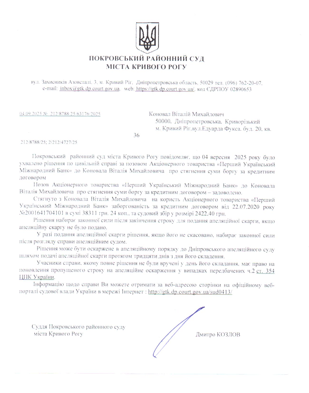 Повідомлення про розгляд цивільної справи за позовом АТ "ПУМБ" до Коновала Віталія Михайловича про стягнення заборгованості за кредитним договором
