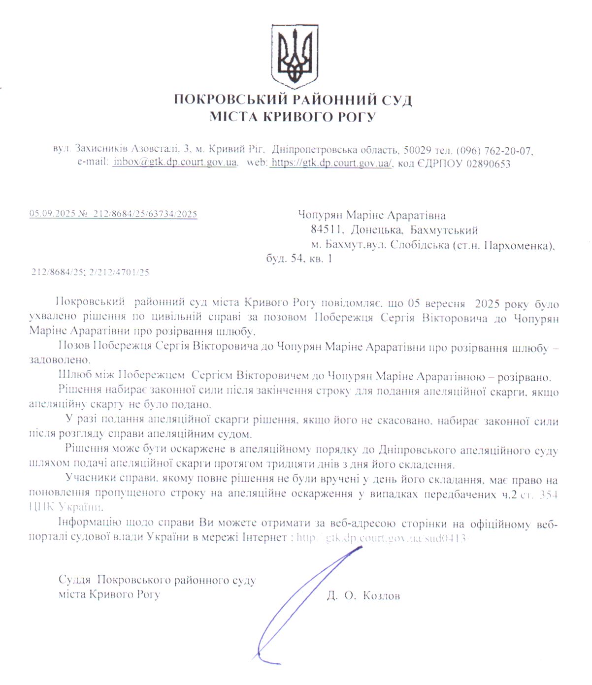 Повідомлення про розгляд цивільної справи за позовом Побережця Сергія Вікторовича до Чопурян Маріне Араратівни про розірвання шлюбу