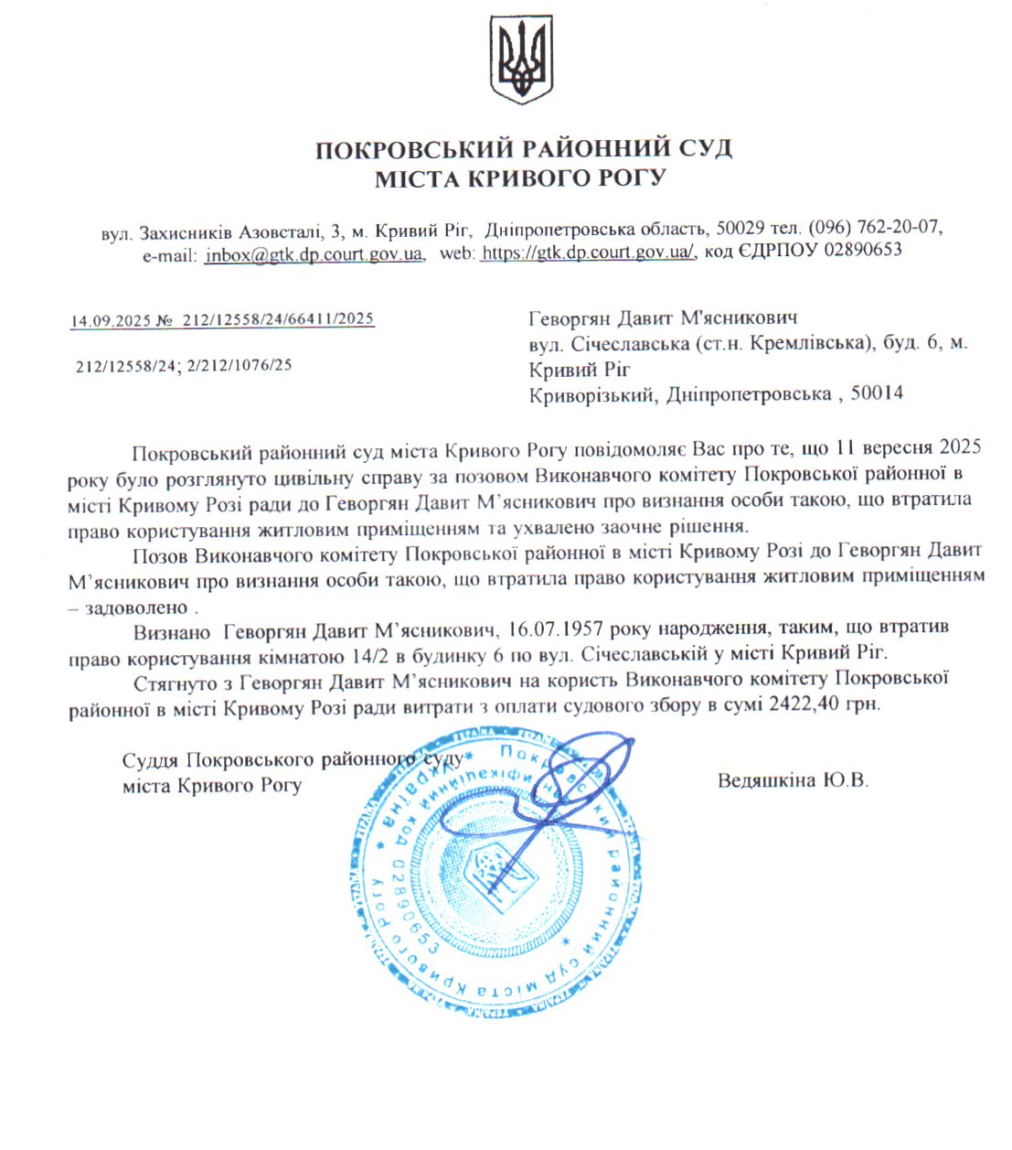 Повідомлення про розгляд цивільної справи за позовом Виконавчого комітету Покровської районної у місті ради до Геворгяна Давита М'ясниковича