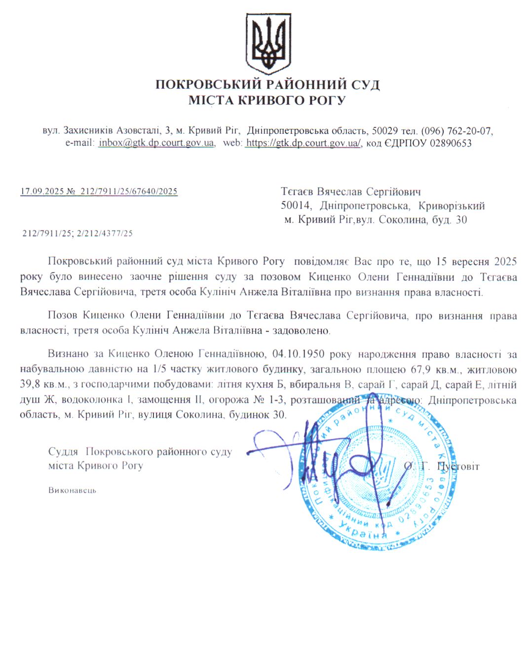 Повідомлення про розгляд цивільної справи за позовом Киценко Олени Геннадіївни до Тєгаєва Вячеслава Сергійовича про визнання права власності