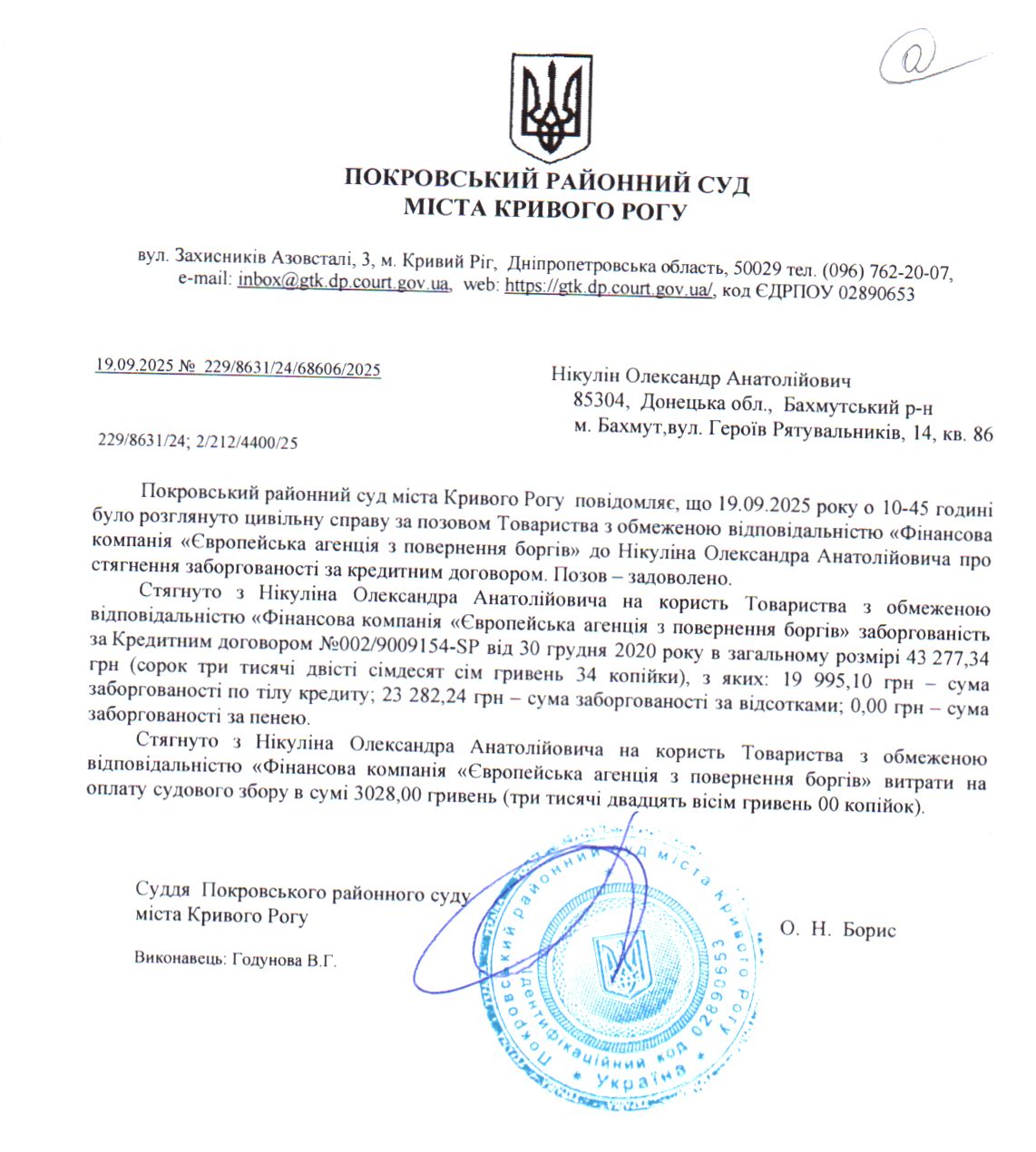 Повідомлення про розгляд цивільної справи за позовом ТОВ з обмеженою відповідальністю "Фінансова компанія "Європейська агенція з повернення боргів"" до Нікуліна Олександра Анатолійовича про стягнення заборгованості за кредитним договором