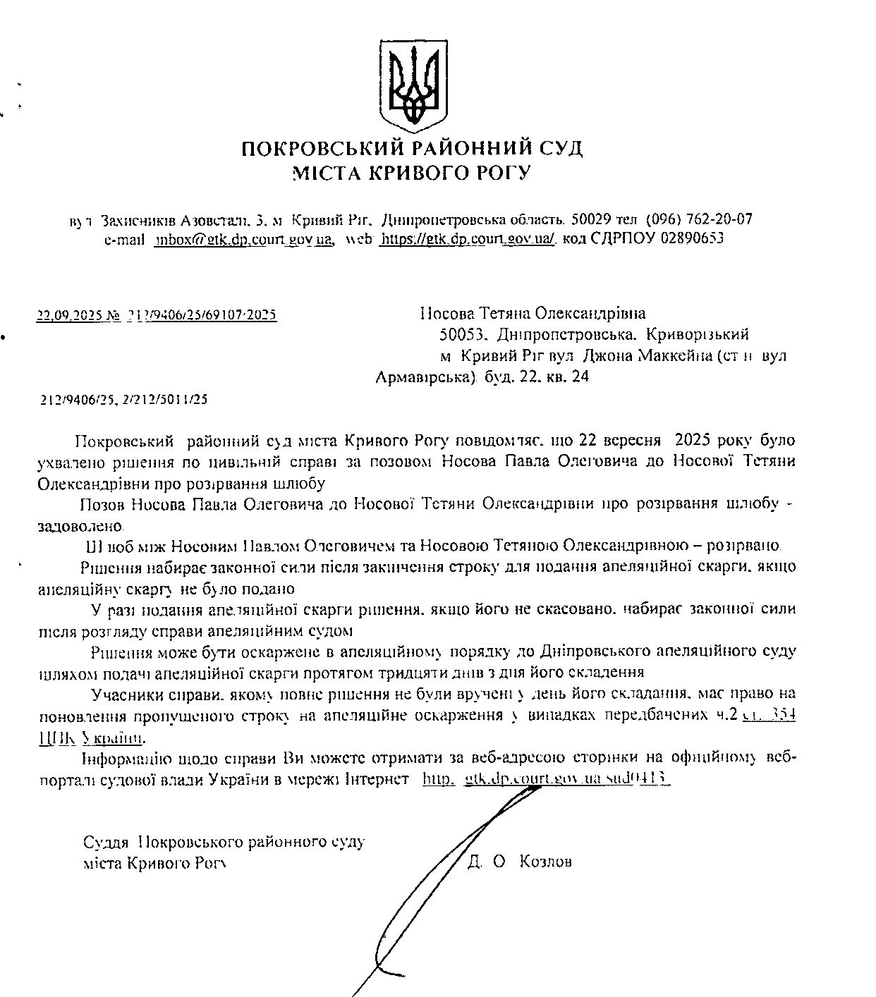 Повідомлення про розгляд цивільної справи за позовом Носова Павла Олеговича до Носової Тетяни Олександрівни про розірвання шлюбу