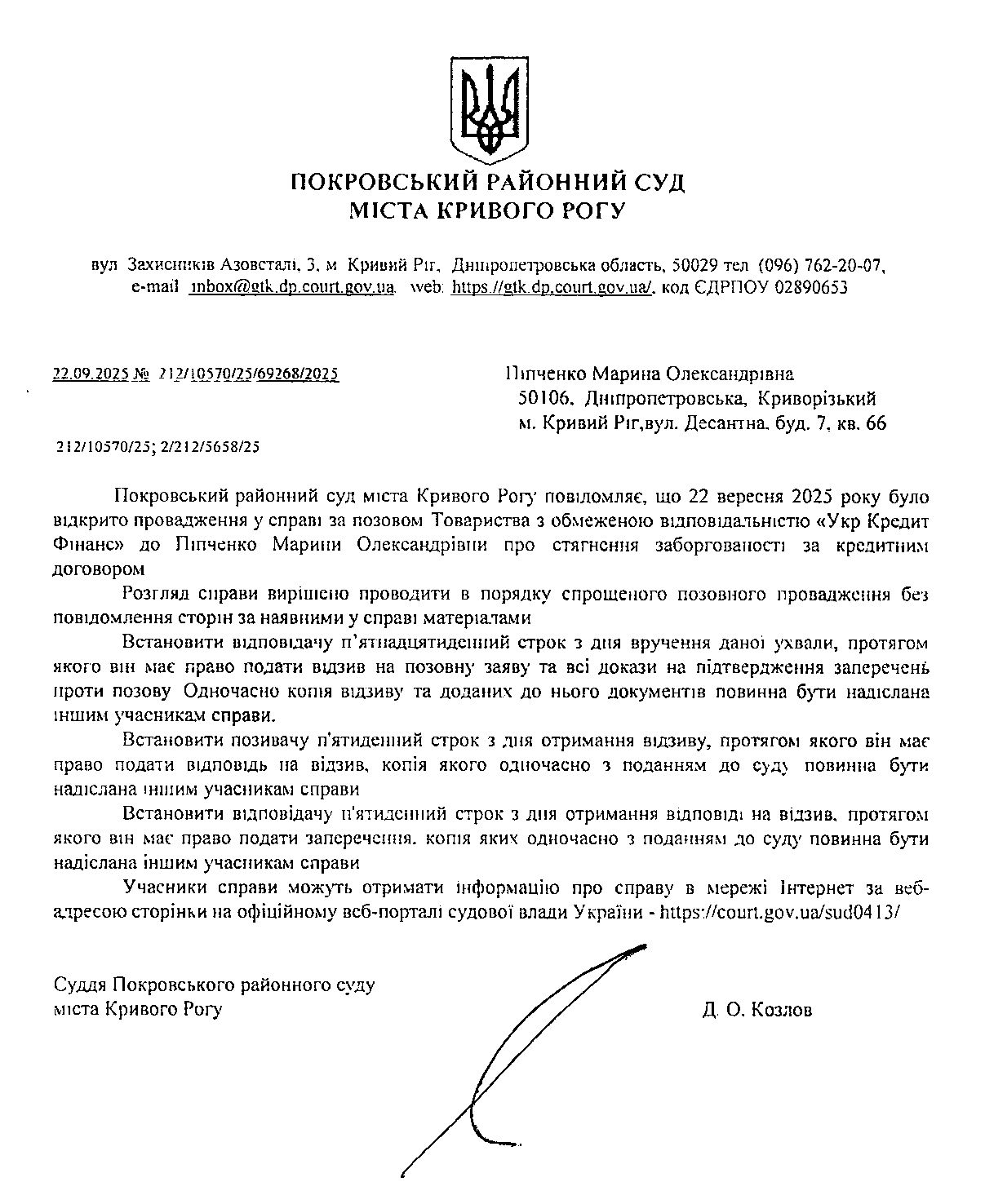 Повідомлення про розгляд цивільної справи за позовом ТОВ з обмеженою відповідальністю "УКР КРЕДИТ ФІНАНС" до Піпченко Марини Олександрівни про стягнення заборгованості за кредитним договором