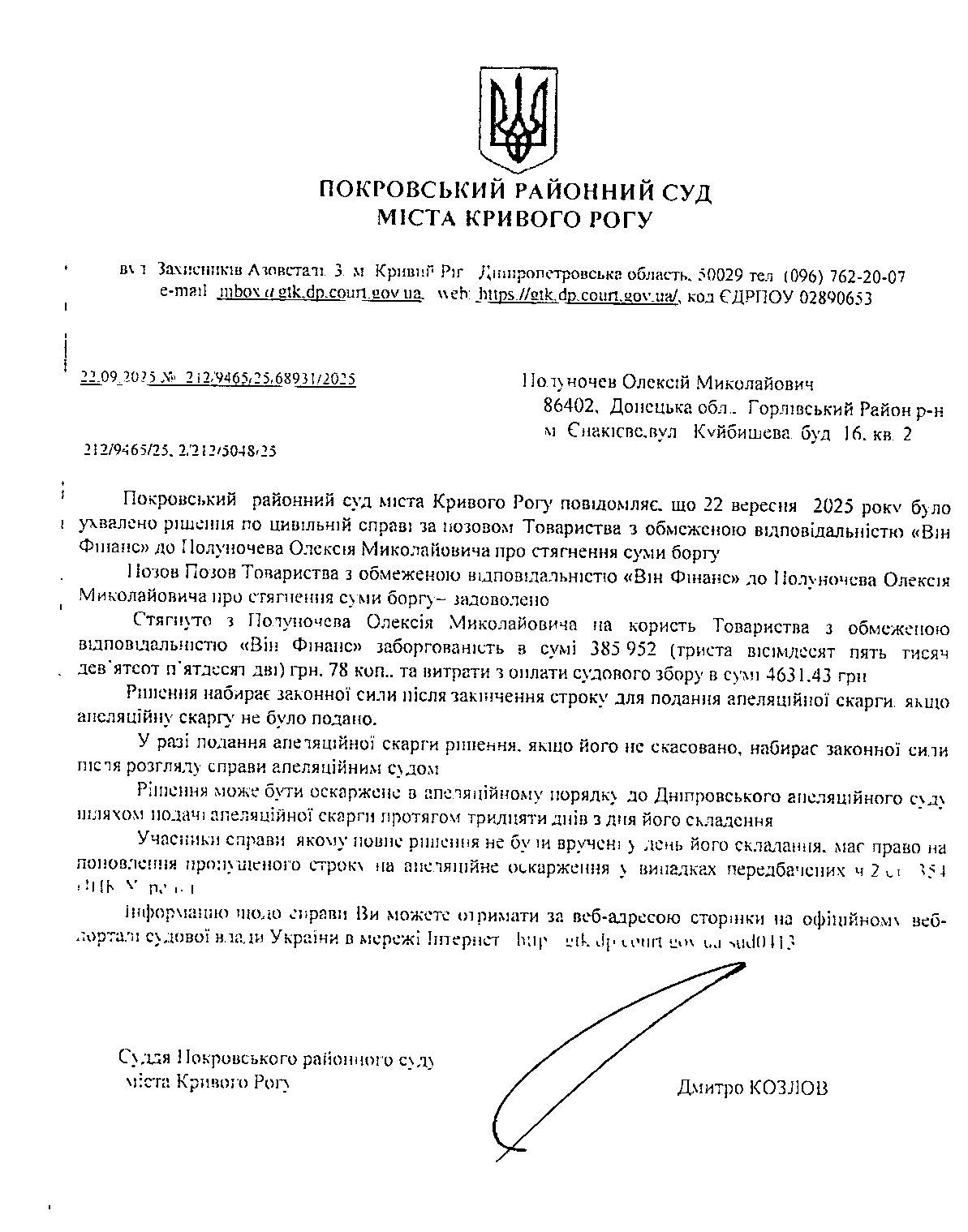 Повідомлення про розгляд цивільної справи за позовом ТОВ з обмеженою відповідальністю "ВІН ФІНАНС" до Полуночева Олексія Миколайовича про стягнення заборгованості за кредитним договором