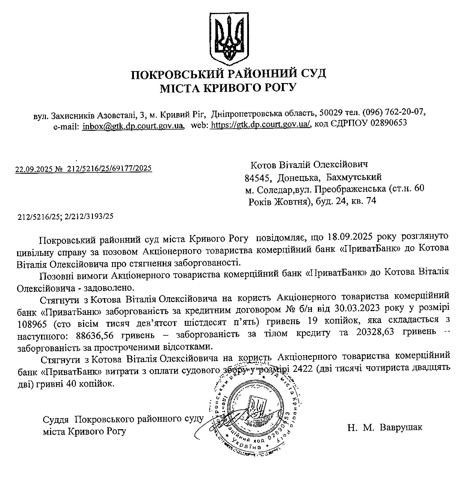 Повідомлення про розгляд цивільної справи за позовом АТ КБ "ПриватБанк" до Котова Віталія Олександровича про стягнення заборгованості