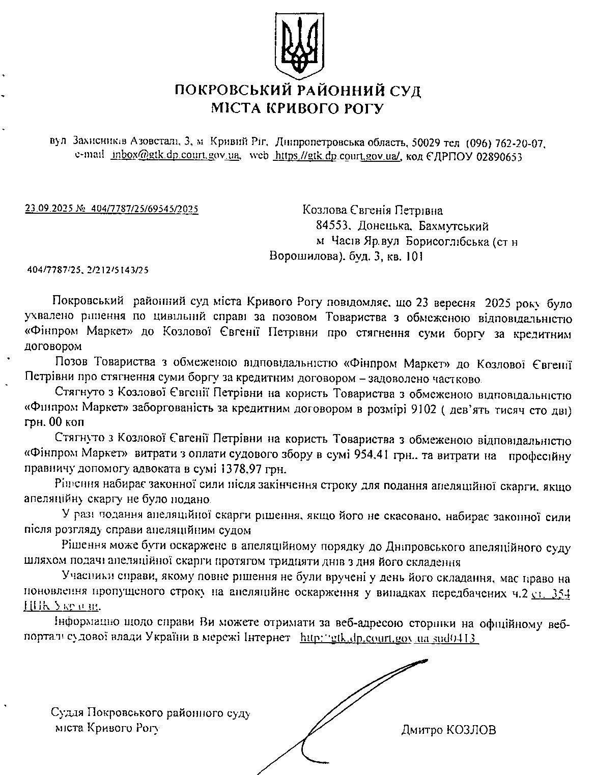 Повідомлення про розгляд цивільної справи за позовом ТОВ "ФІНПРОМ МАРКЕТ" до Козлової Євгенії Петрівни про стягнення заборгованості за кредитним договором