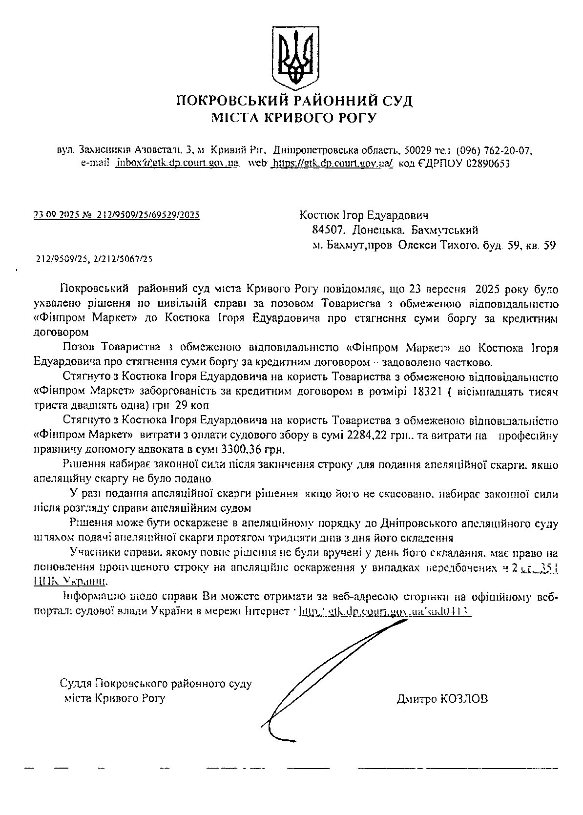 Повідомлення про розгляд цивільної справи за позовом ТОВ "ФІНПРОМ МАРКЕТ" до Костюка Ігоря Едуардовича про стягнення заборгованості за кредитним договором