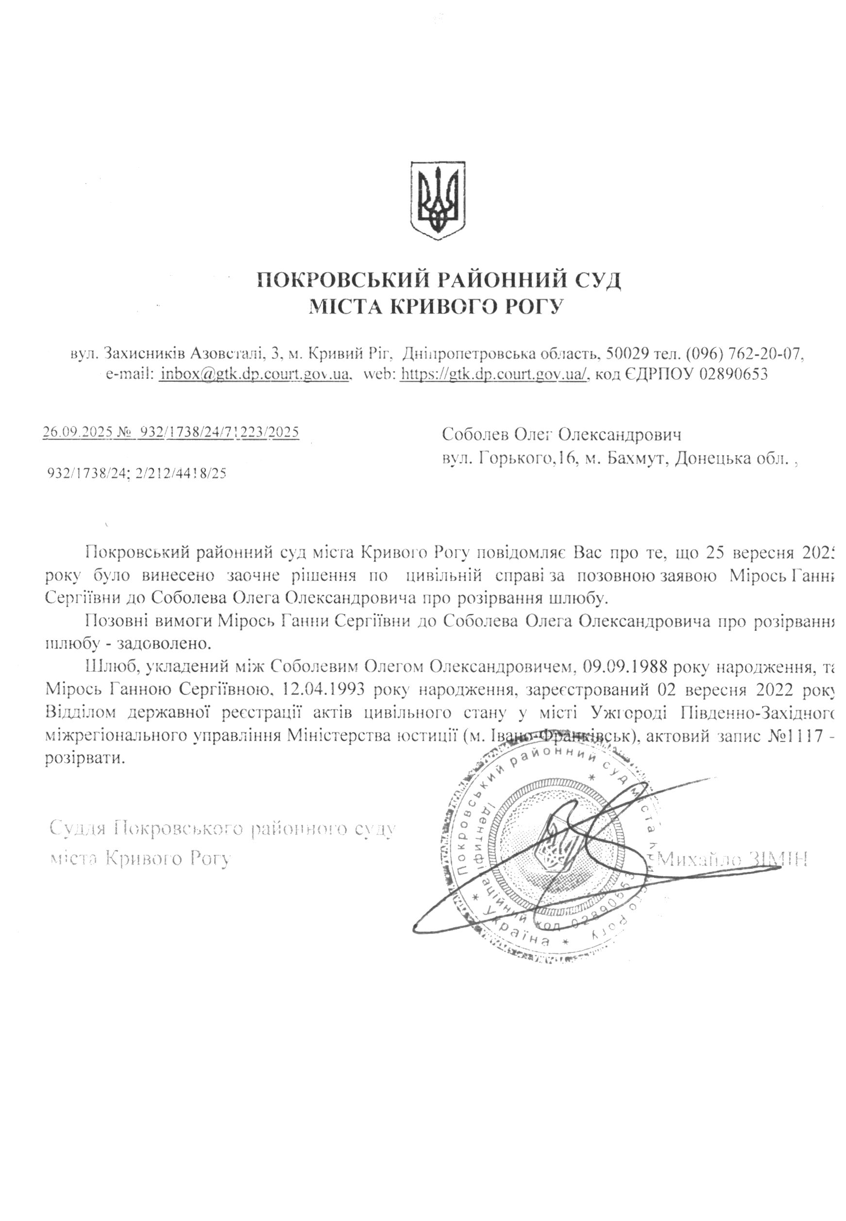 Повідомлення про розгляд цивільної справи за позовом Мірось Ганни Сергіївни до Соболева Олега Олександровича про розірвання шлюбу