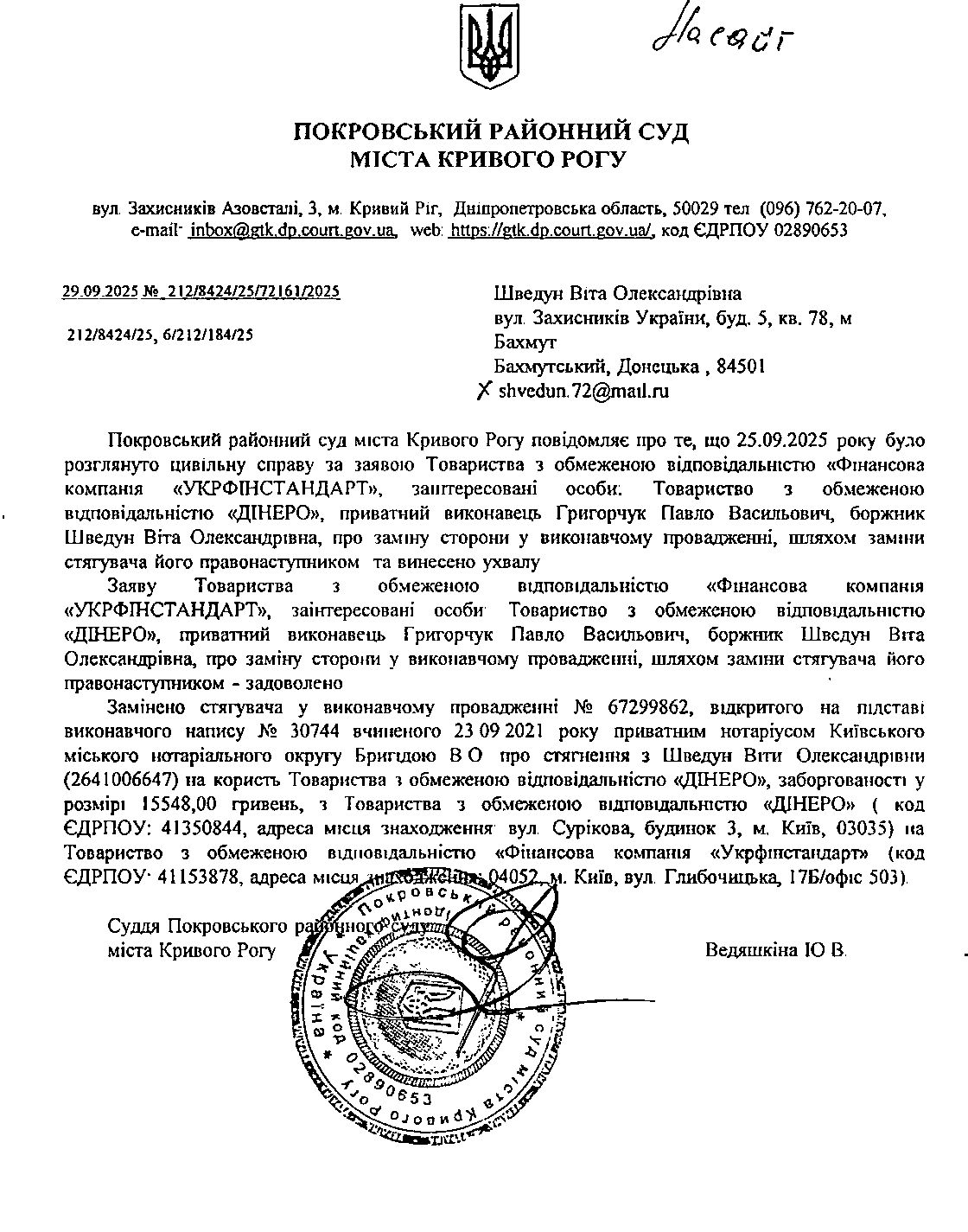 Повідомлення про розгляд цивільної справи винесено ухвалу у цивільній справі за заявою ТОВ "Фінансова компанія "Укрфінстандарт" про заміну сторони у виконавчому проваджені Шведун Віти Олександрівни