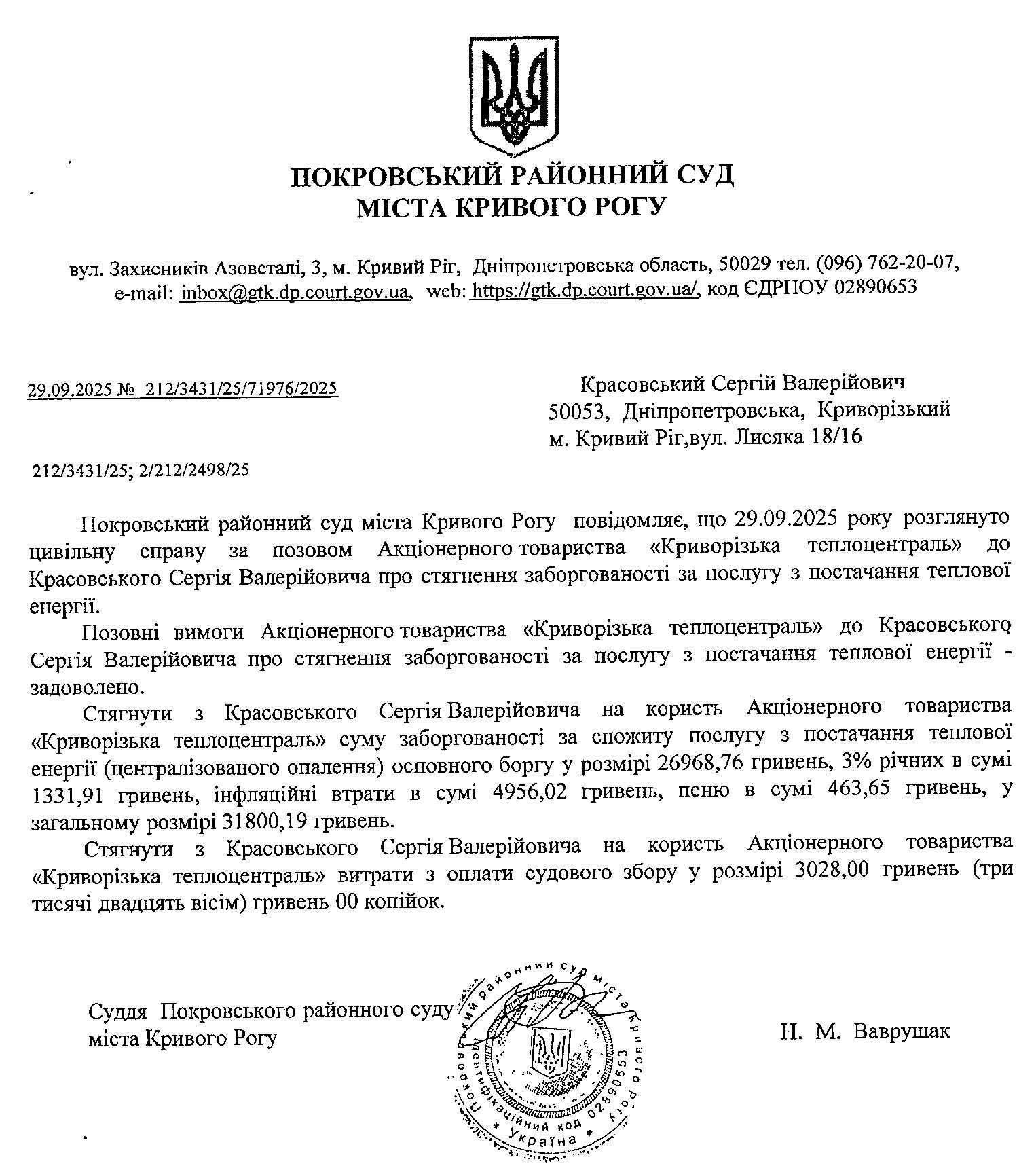 Повідомлення про розгляд цивільної справи за позовом Акціонерного товариства "Криворізька теплоцентраль" до Красовського Сергія Валерійовича про стягнення заборгованості за постачання теплової енергії