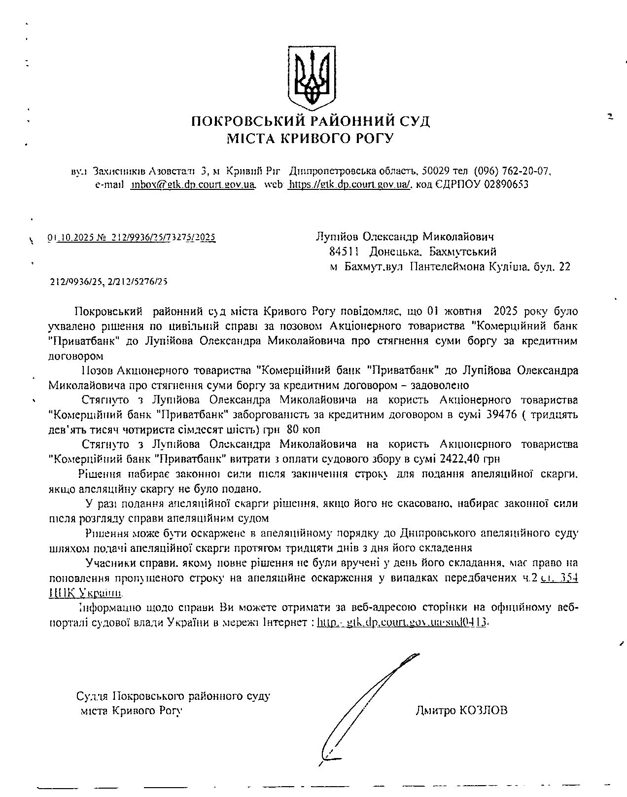 Повідомлення про розгляд цивільної справи за позовом АТ КБ "ПриватБанк" до Лупійова Олександра Миколайовича про стягнення заборгованості