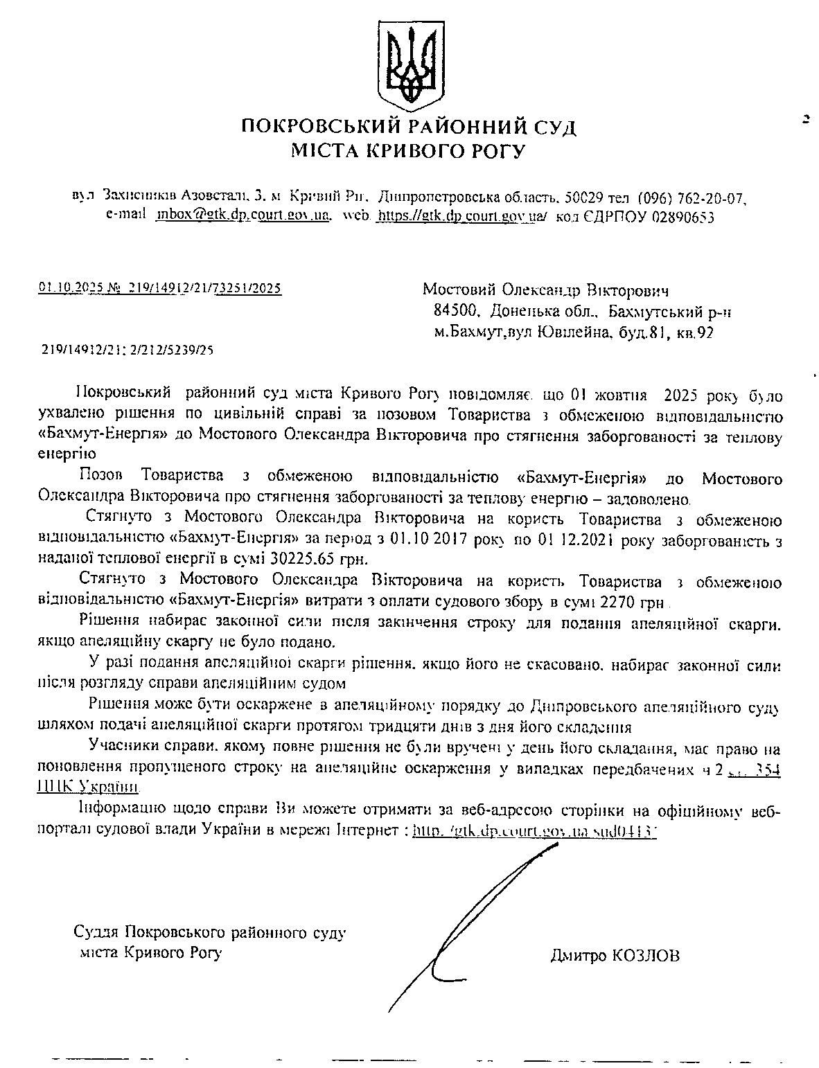 Повідомлення про розгляд цивільної справи за позовом ТОВ "Бахмут-Енергія" до Мостового Олександра Вікторовича про стягнення заборгованості