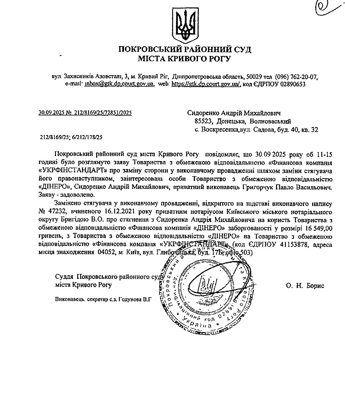 Повідомлення про розгляд цивільної справи за позовом ТОВ з обмеженою відповідальністю "УКРФІНСТАНДАРТ", заінтересована особа ТОВ "ДІНЕРО", Сидоренко Андрій Миколайович про зміну стягувача його правонаступником