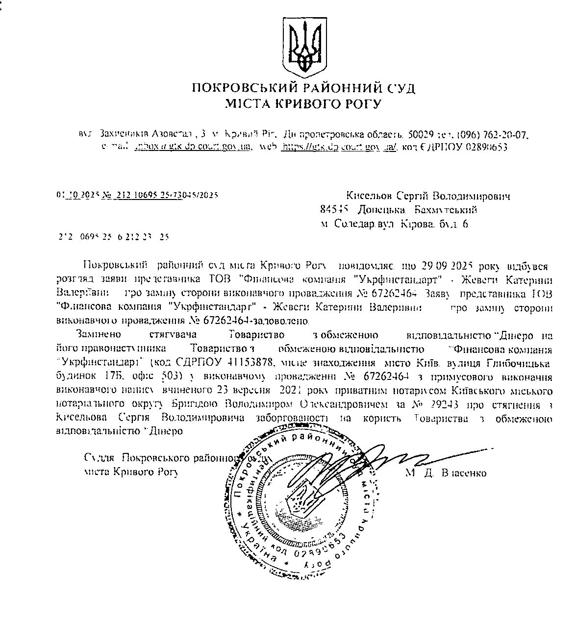 Повідомлення про розгляд цивільної справи за позовом ТОВ з обмеженою відповідальністю "УКРФІНСТАНДАРТ", Кисельова Сергія Володимировича про зміну стягувача його правонаступником