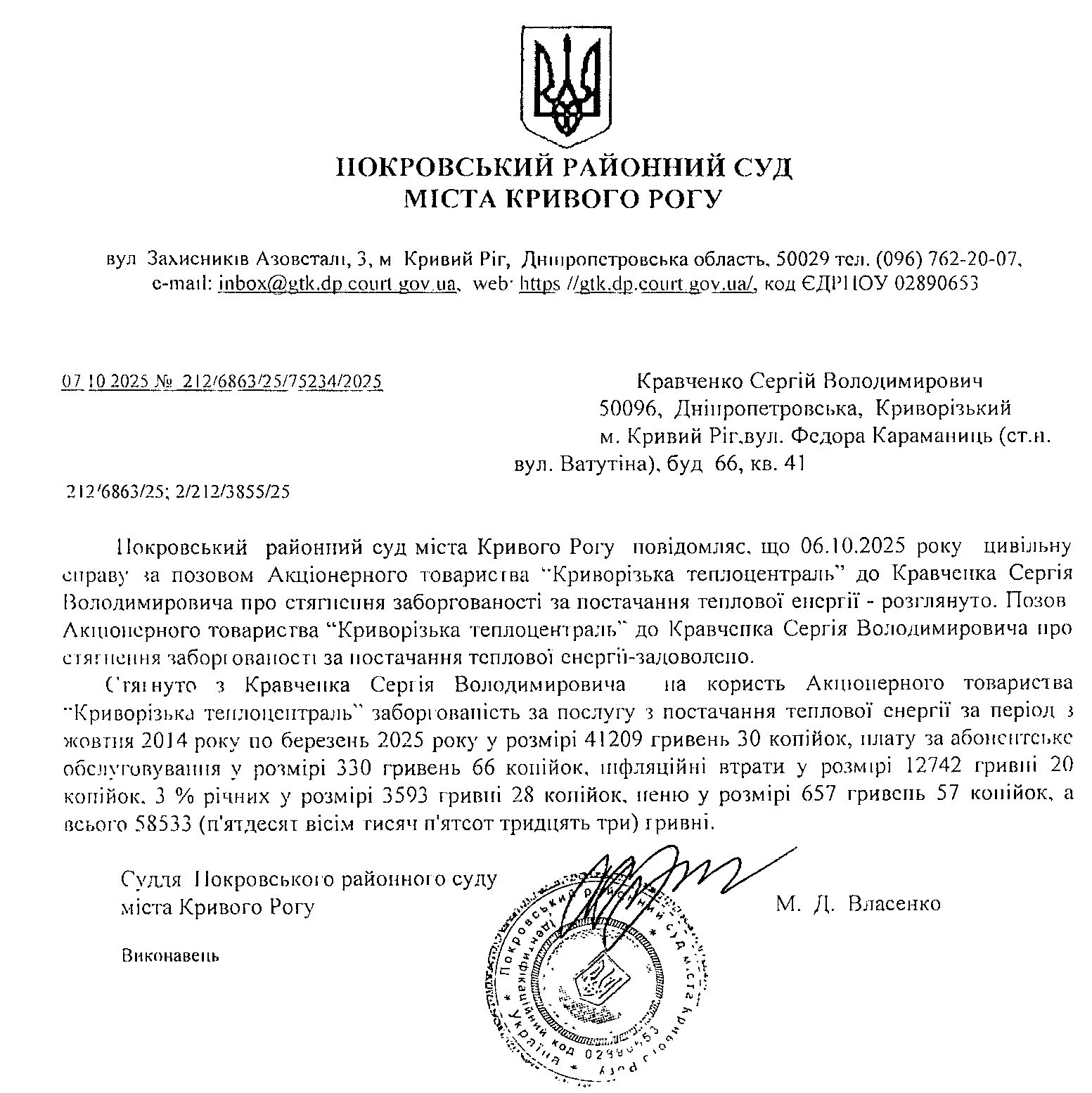 Повідомлення про розгляд цивільної справи за позовом Акціонерного товариства "Криворізька теплоцентраль" до Кравченка Сергія Володимировича про стягнення заборгованості за постачання теплової енергії