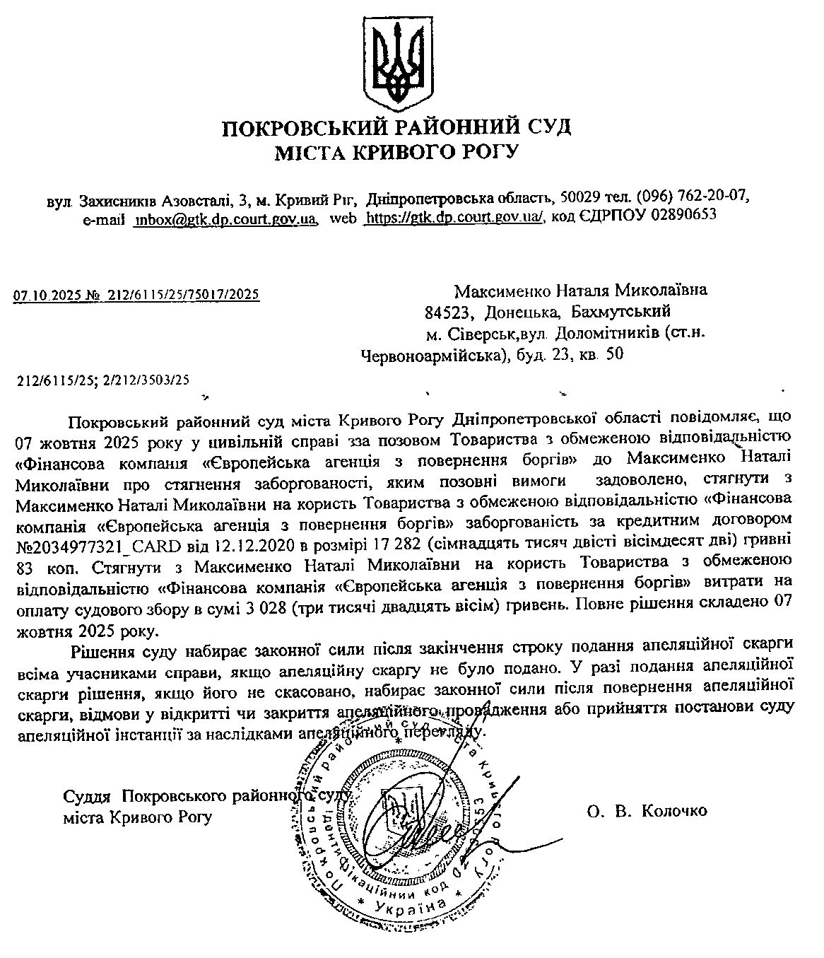 Повідомлення про розгляд цивільної справи за позовом ТОВ з обмеженою відповідальністю "Фінансова компанія "Європейська агенція з повернення боргів"" до Максименко Наталі Миколвївни про стягнення заборгованості за кредитним договором