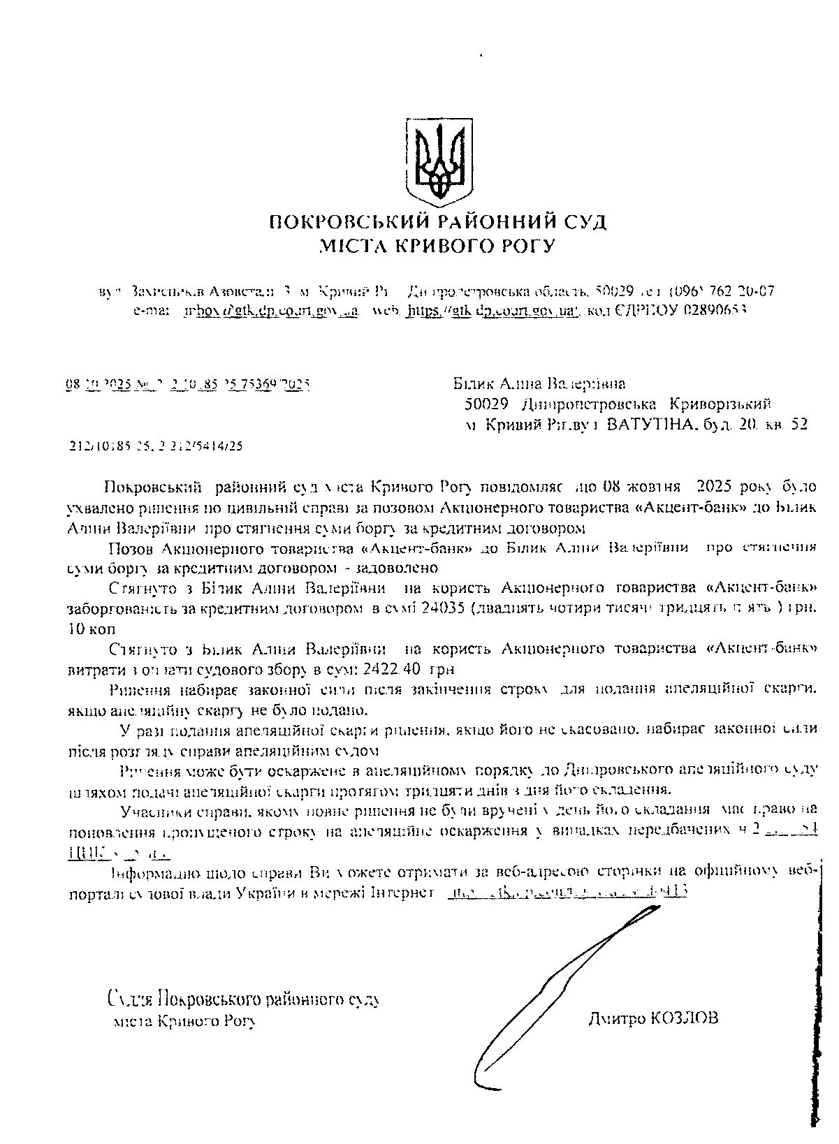 Повідомлення про розгляд цивільної справи за позовом АТ "Акцент-Банк" до Білик Аліни Валеріївни про стягнення заборгованості