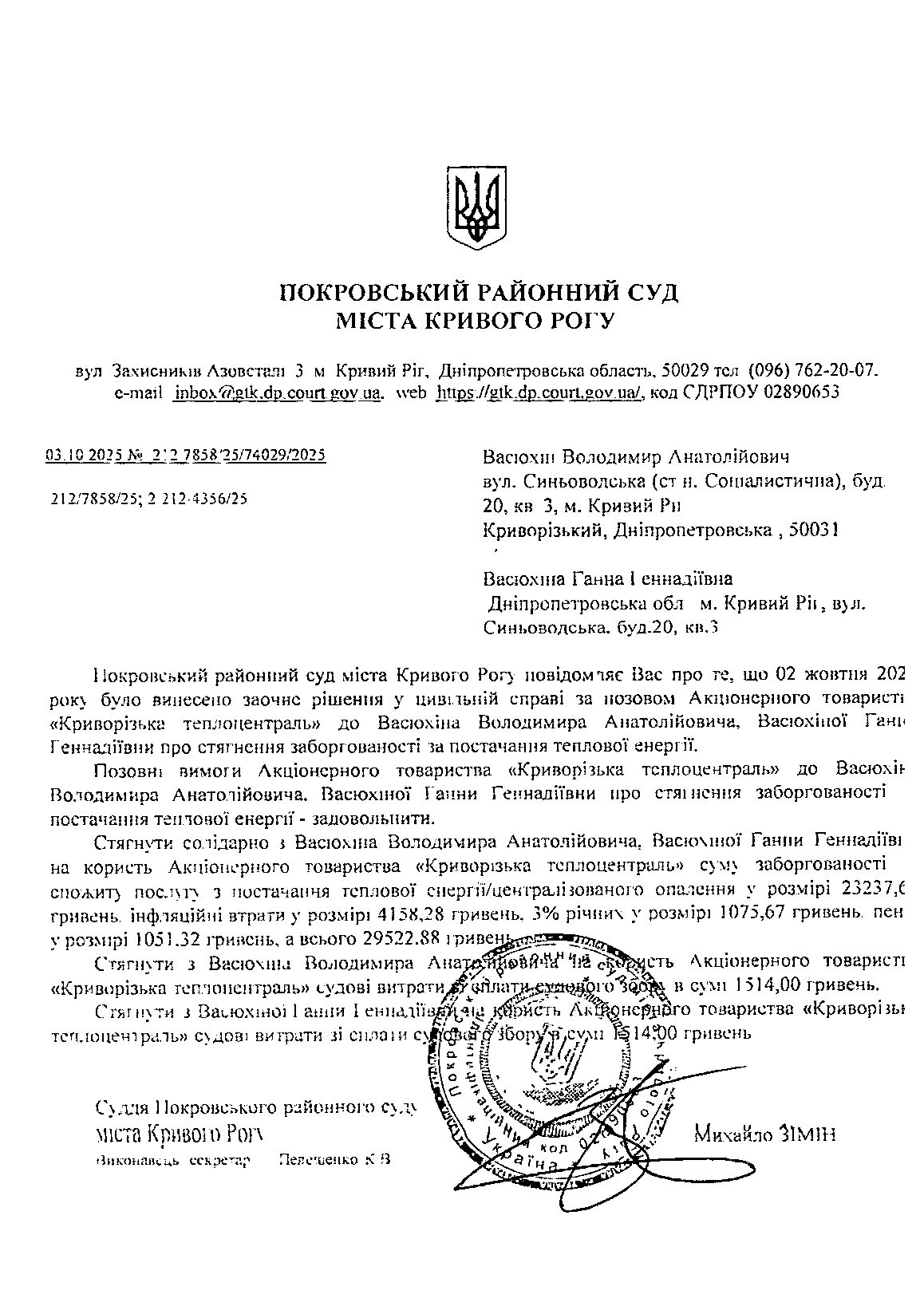 Повідомлення про розгляд цивільної справи за позовом Акціонерного товариства "Криворізька теплоцентраль" до Васюхіна Володимира Анатолійовича, васюхіної Ганни Геннадіївни про стягнення заборгованості за постачання теплової енергії