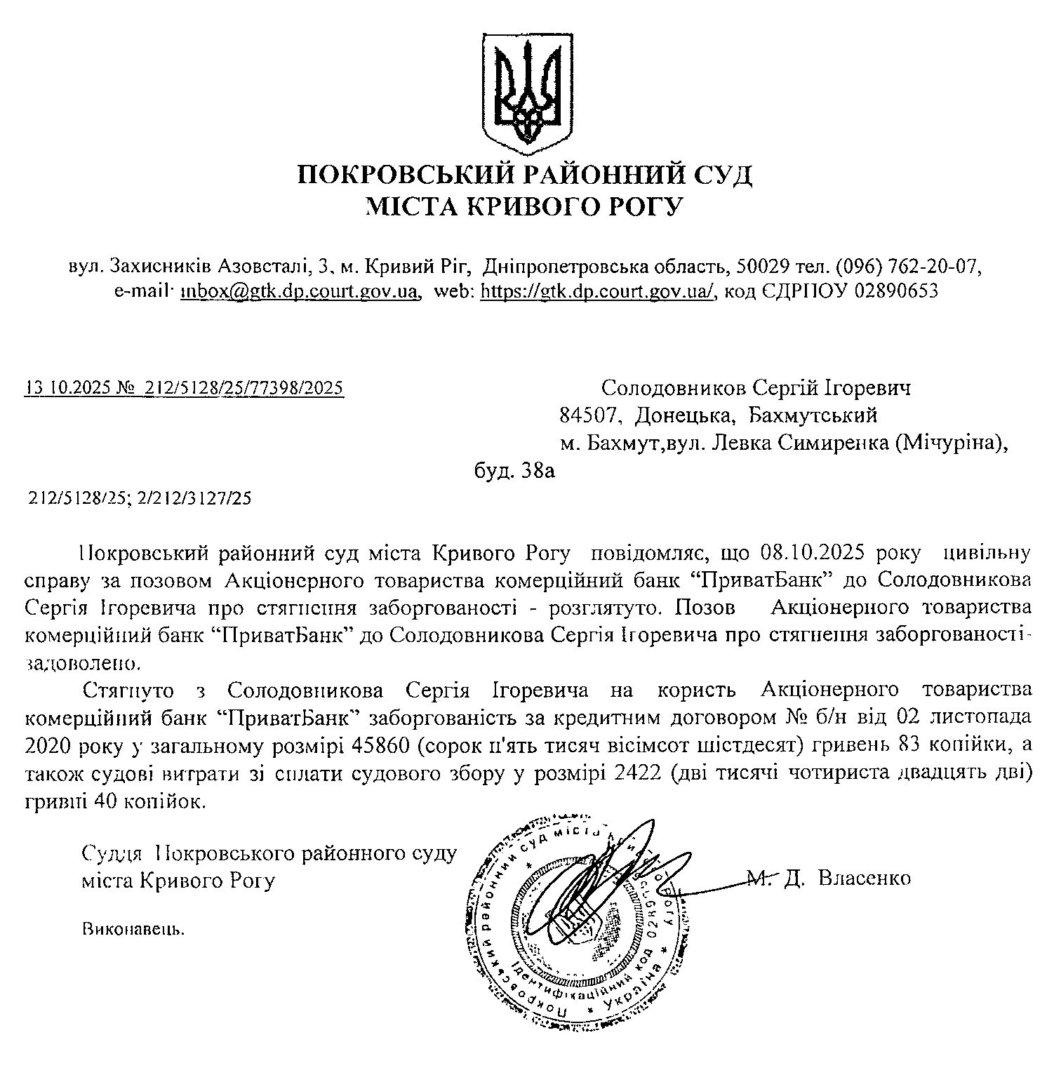 Повідомлення про розгляд цивільної справи за позовом АТ КБ "ПриватБанк" до Солодовникова Сергія Ігоревича про стягнення заборгованості