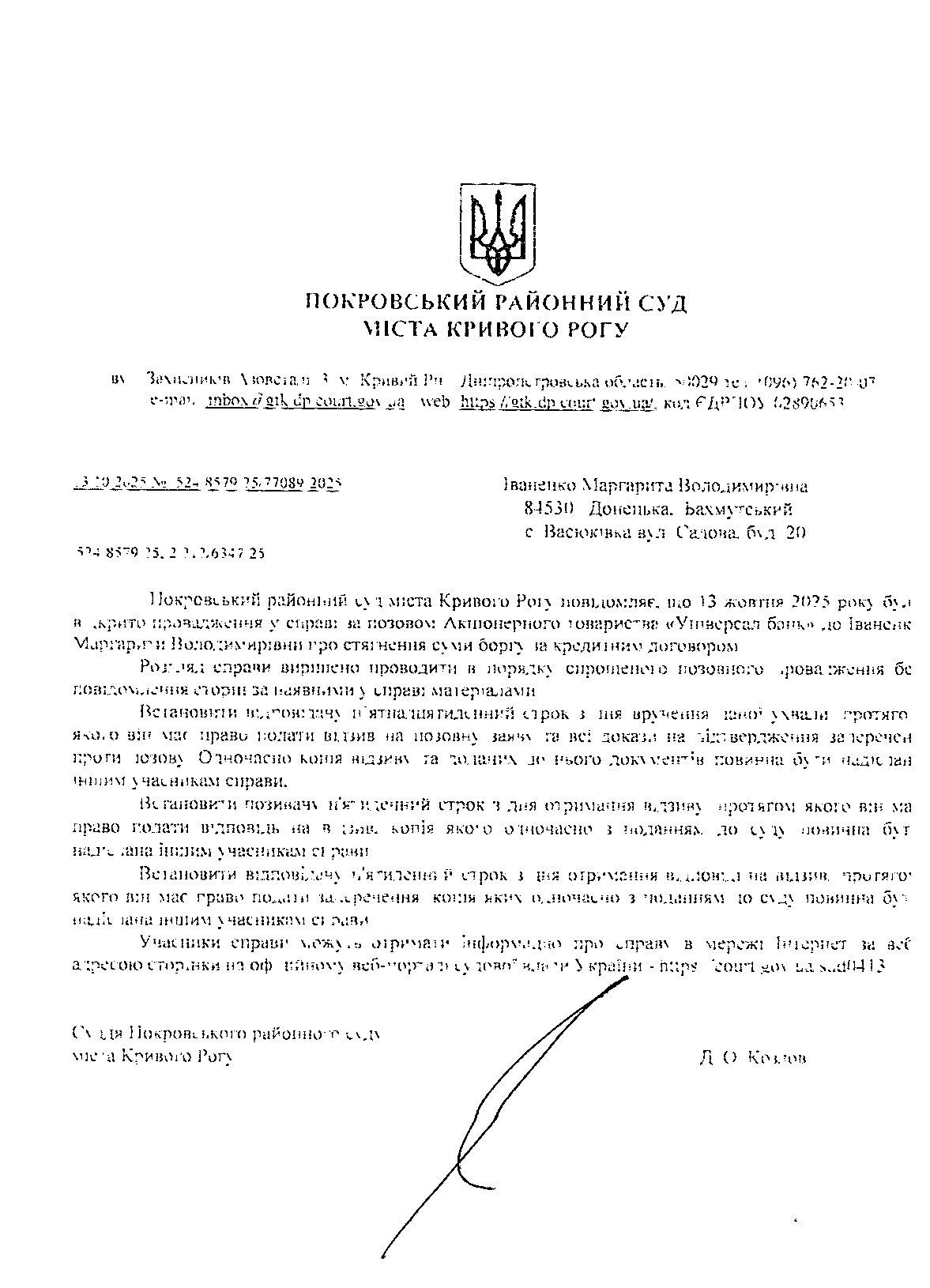 Повідомлення про розгляд цивільної справи за позовом Акціонерного товариства "Універсал банк" до Іваненко Маргарити Володимирівни про стягнення боргу за кредитним договором