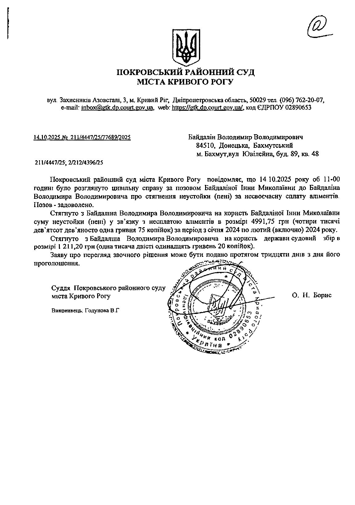 Повідомлення про розгляд цивільної справи за позовом Байдаліної Інни Миколаївни до Байдаліна Володимира Володимировича про стягнення неустойки за несвоєчасну сплату аліментів