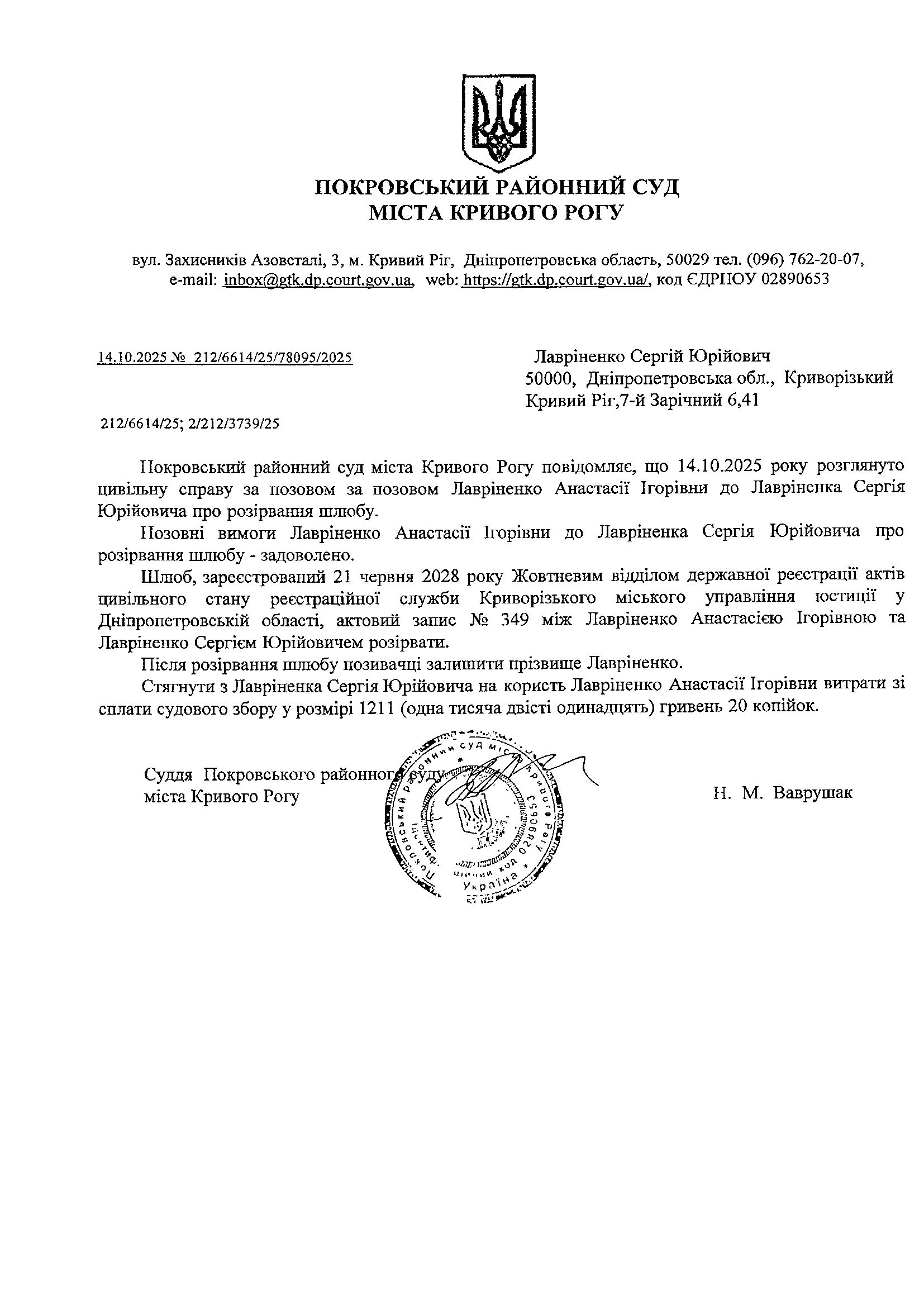 Повідомлення про розгляд цивільної справи за позовом Лавріненко Анастасії Ігорівни до Лавріненка Сергія Юрійовича про розірвання шлюбу